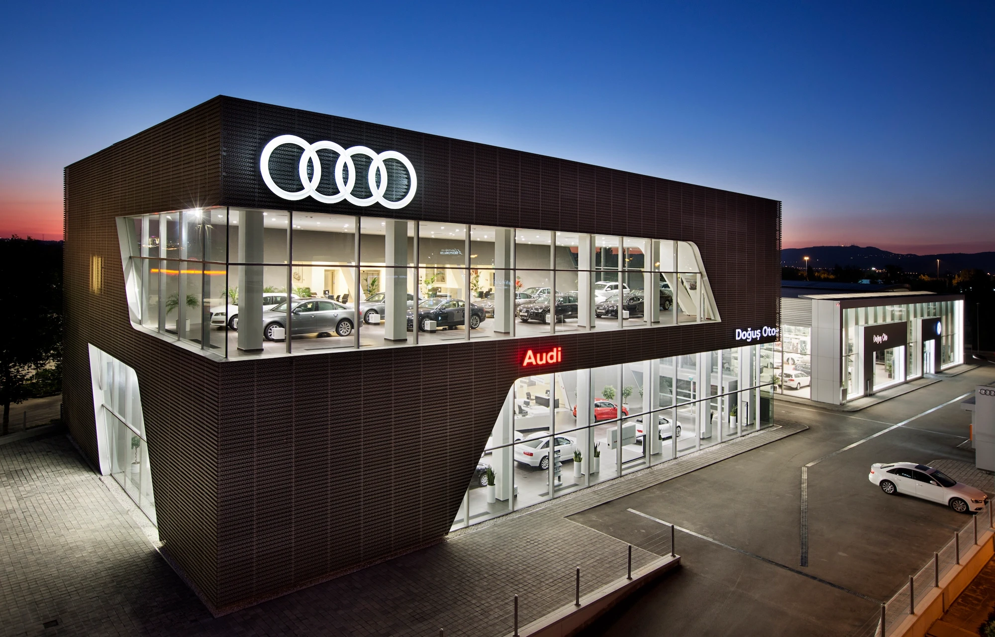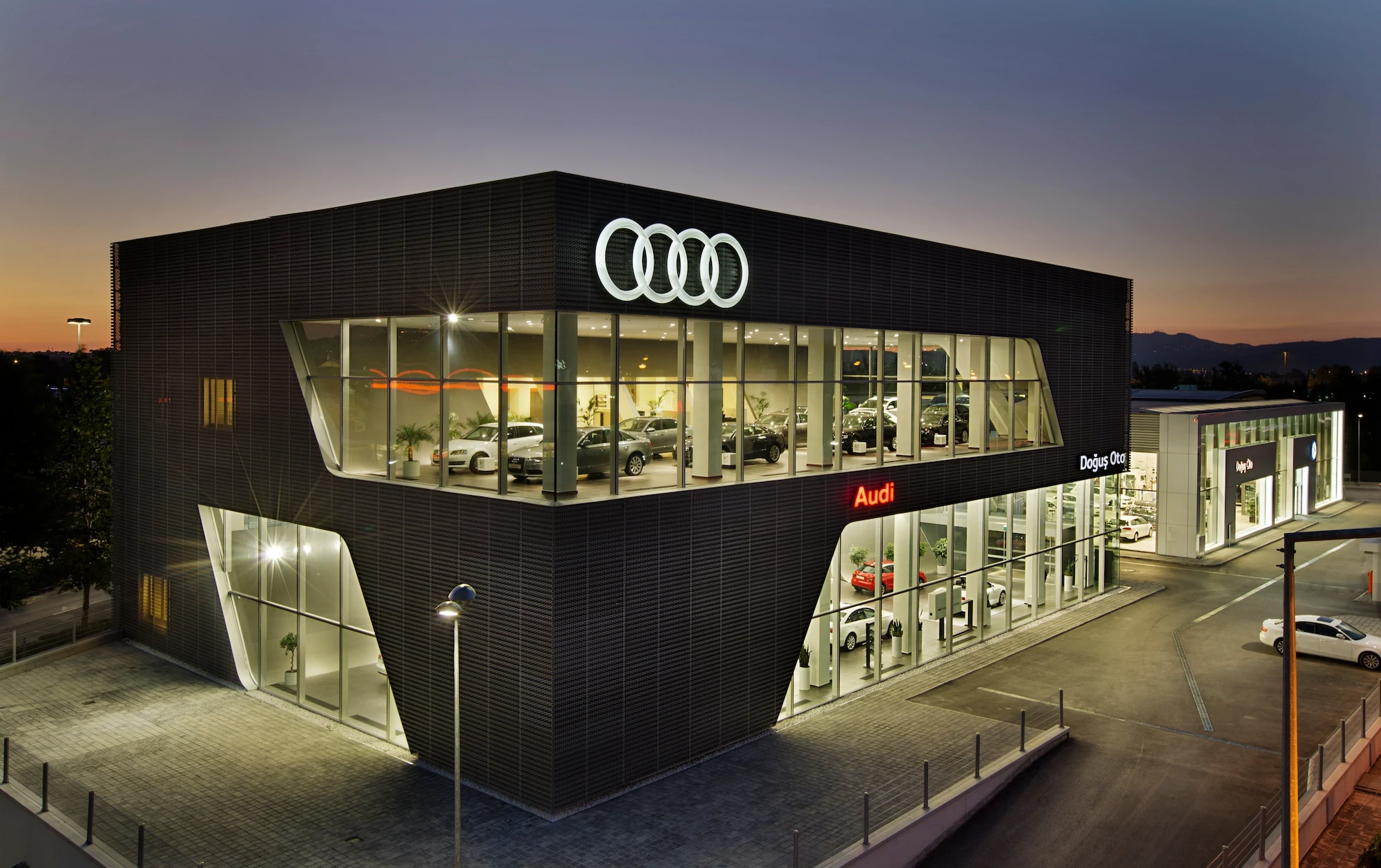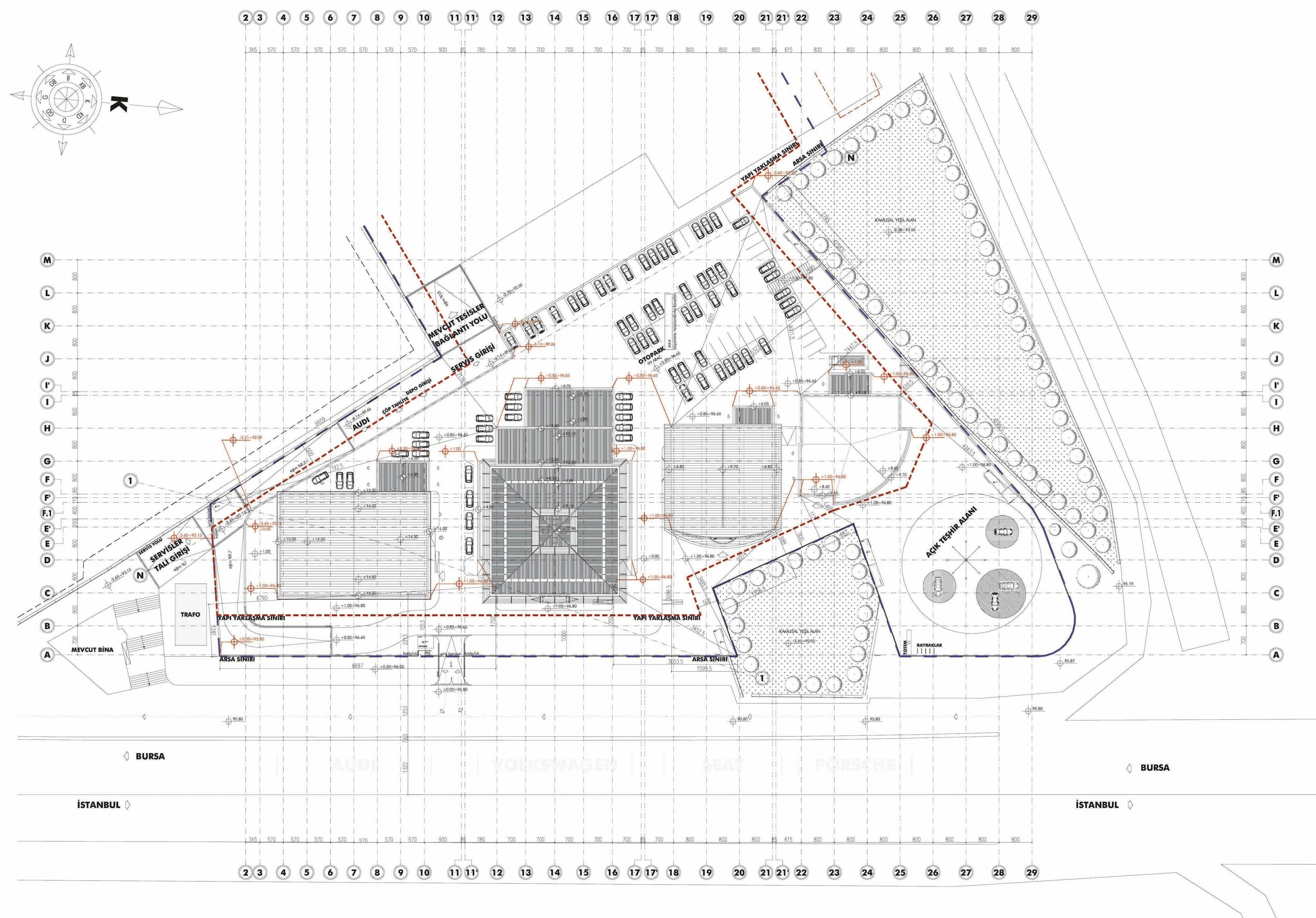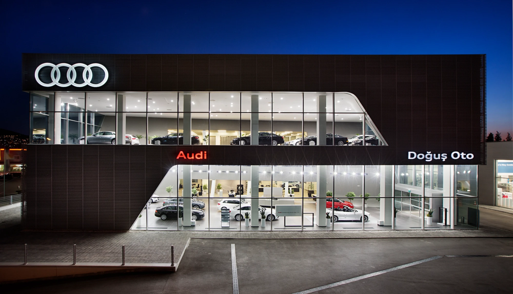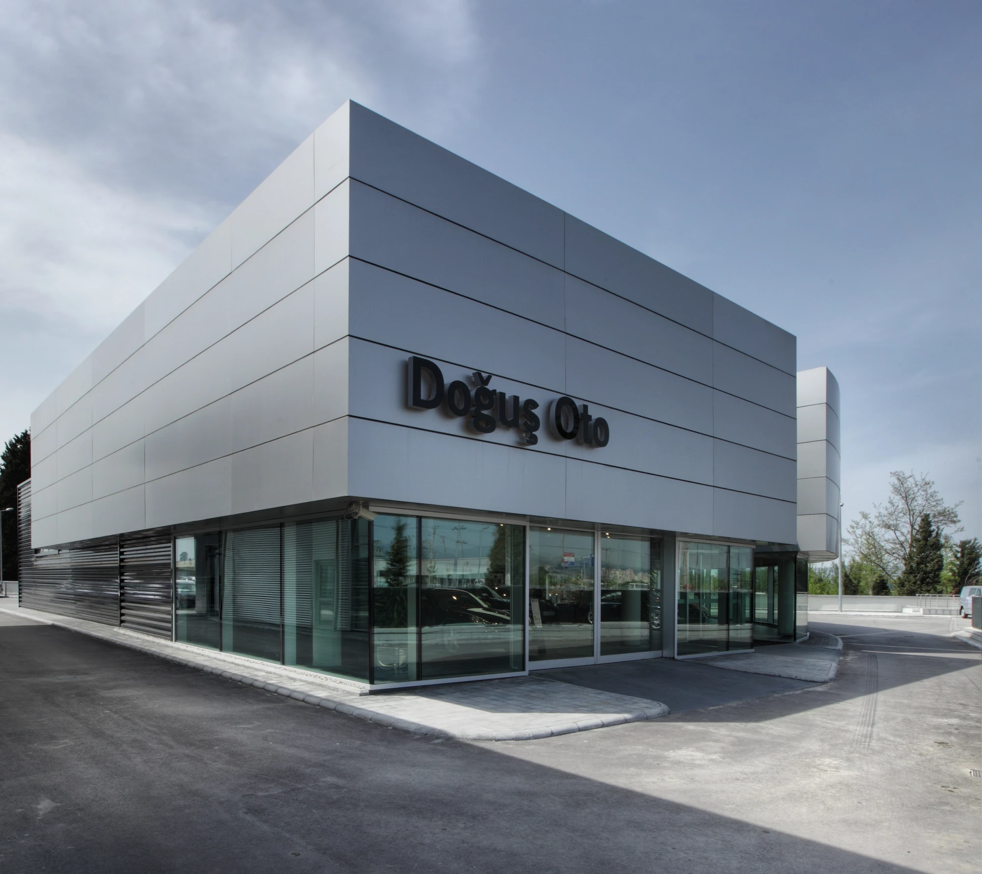 Doğuş Oto Bursa Facilities, located next to the Bursa - Yalova inter-city road, were designed as a common synergy area where 4 brands with different corporate identities come together in the same campus. Vehicle display structures are planned on the platform, and common service areas are planned below so that the perception of the environment is at the highest level.