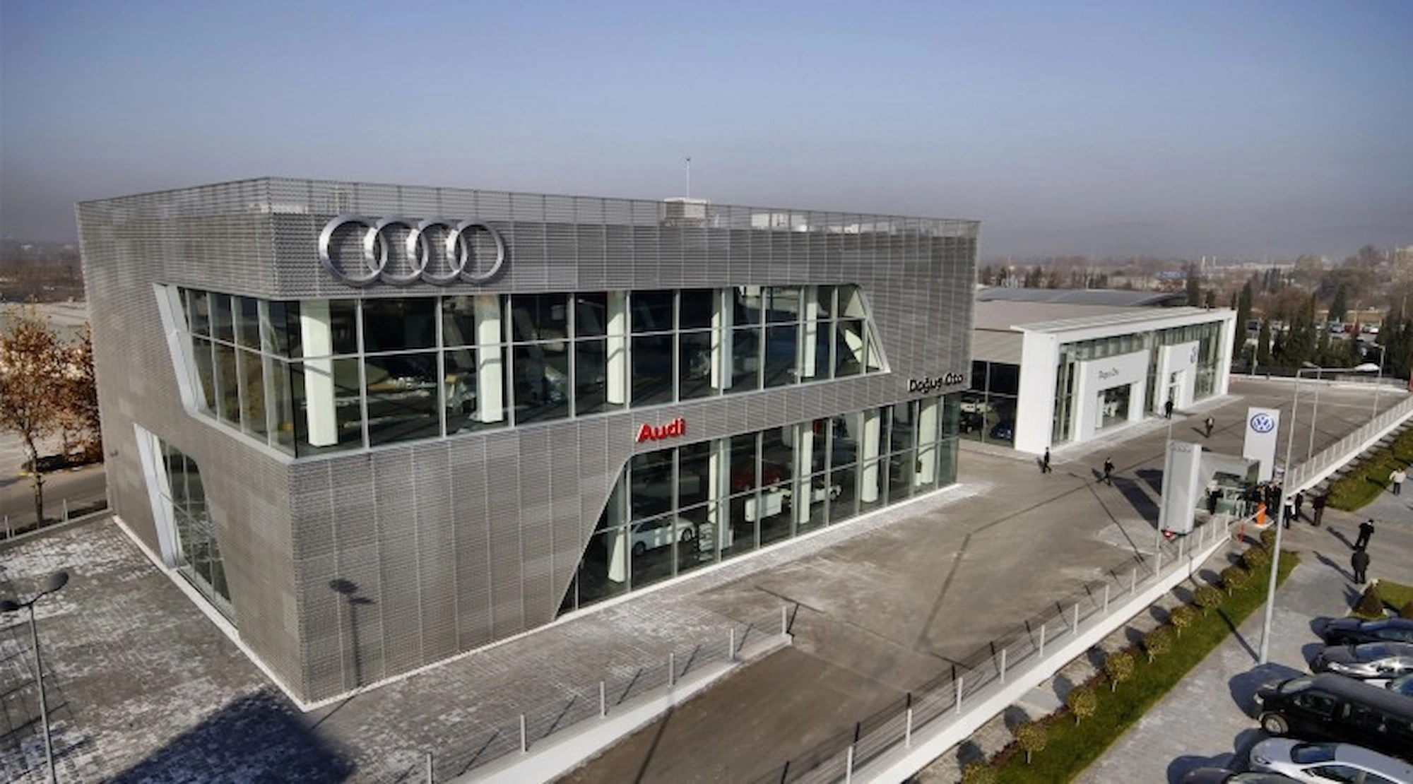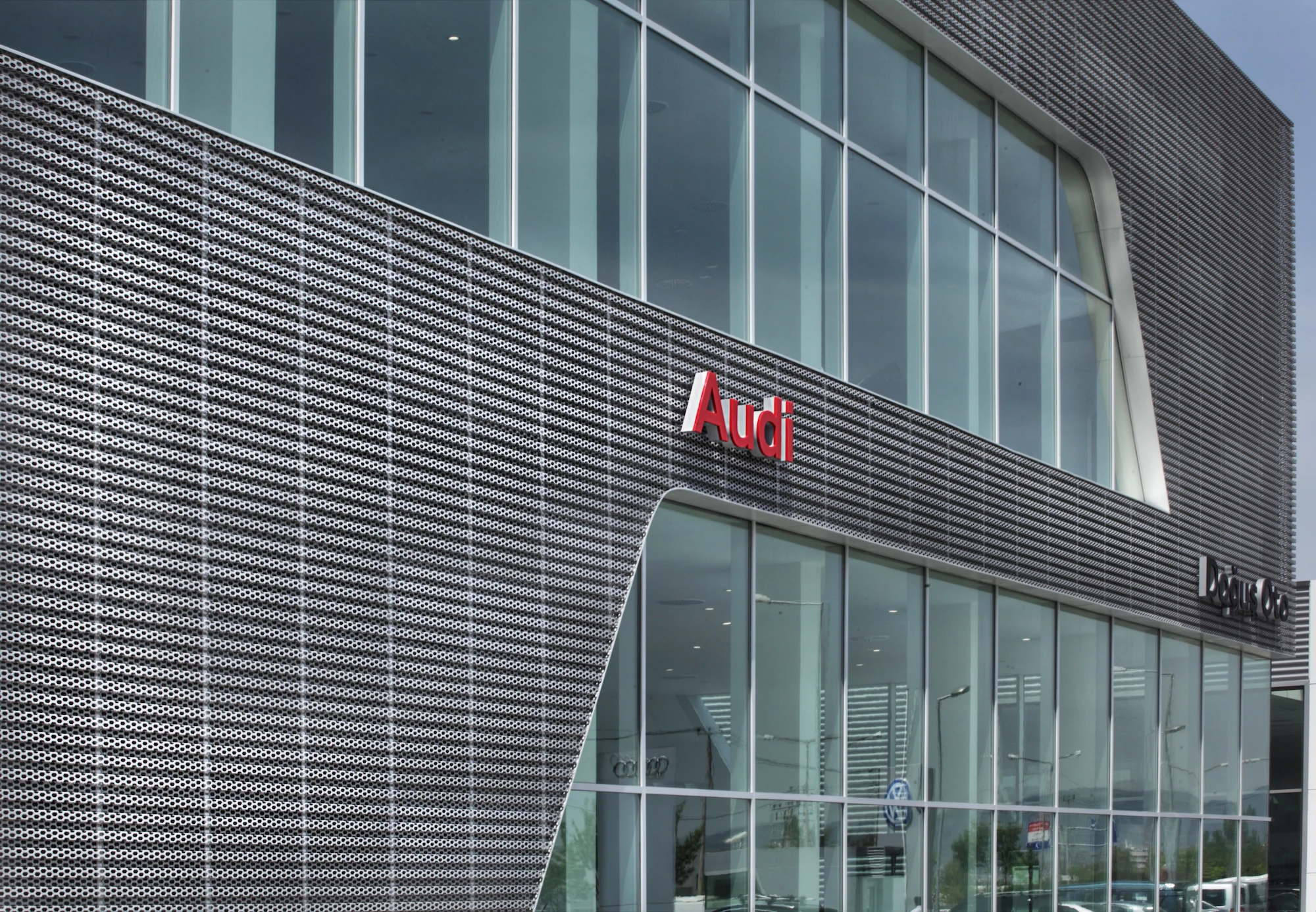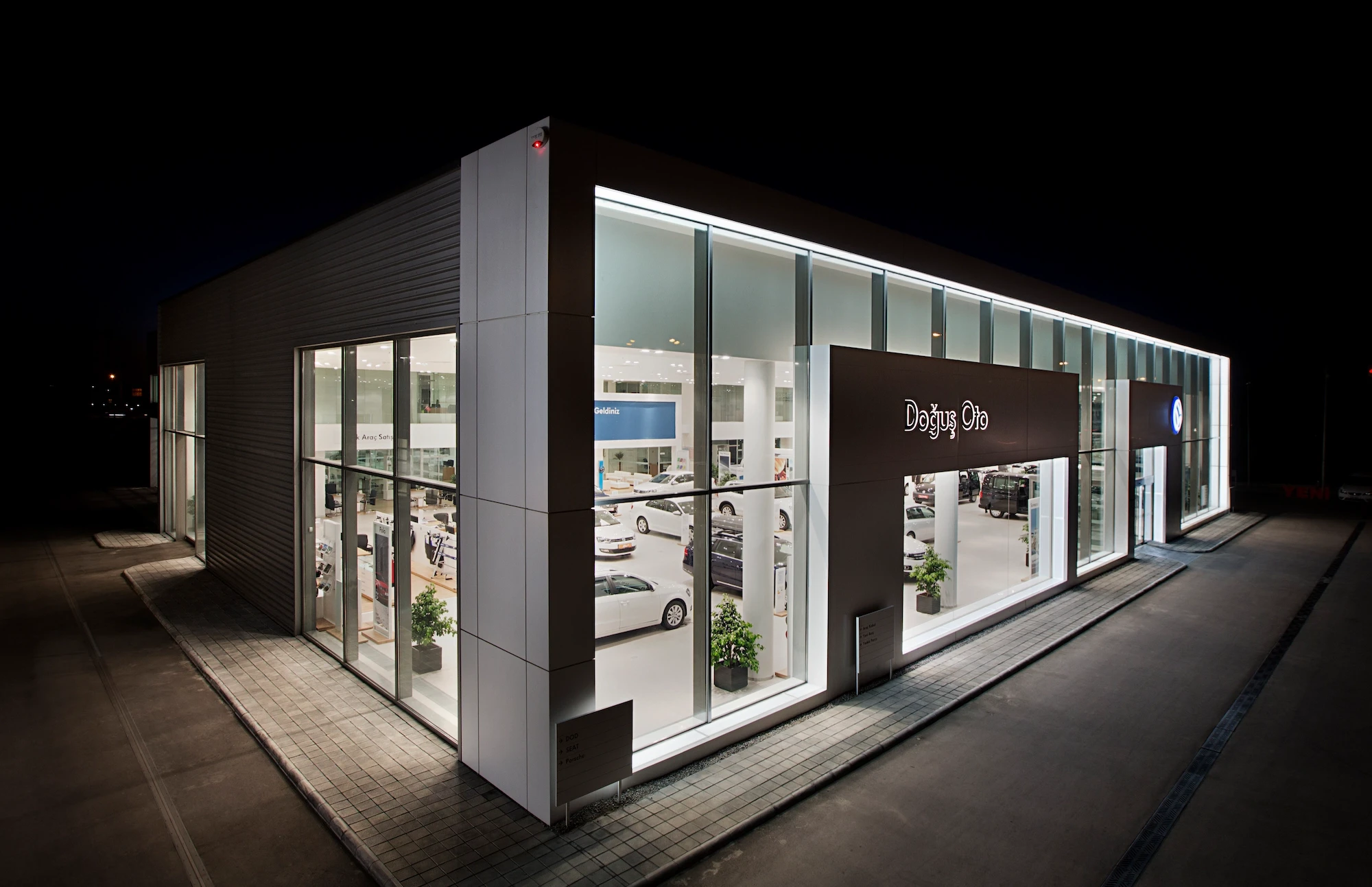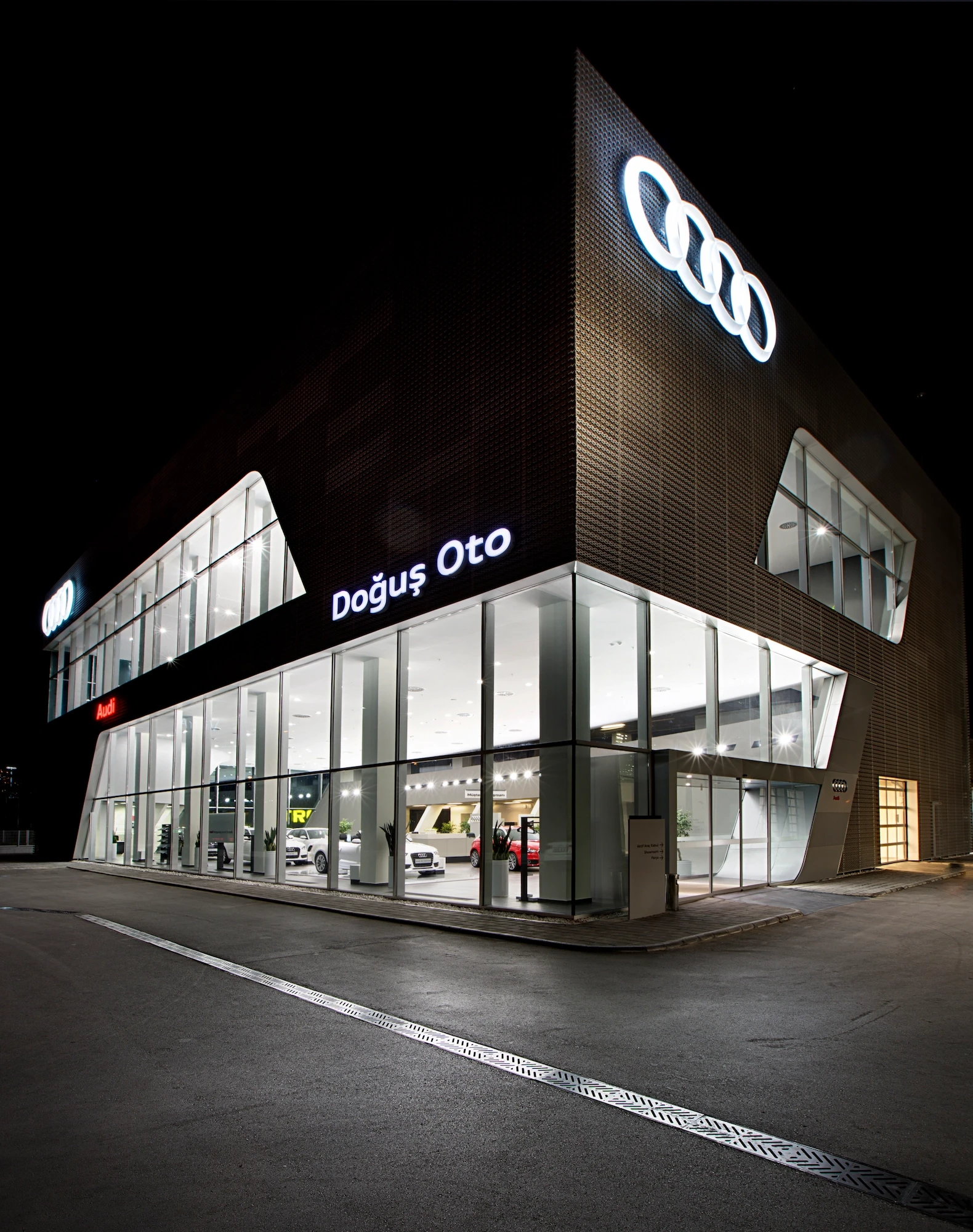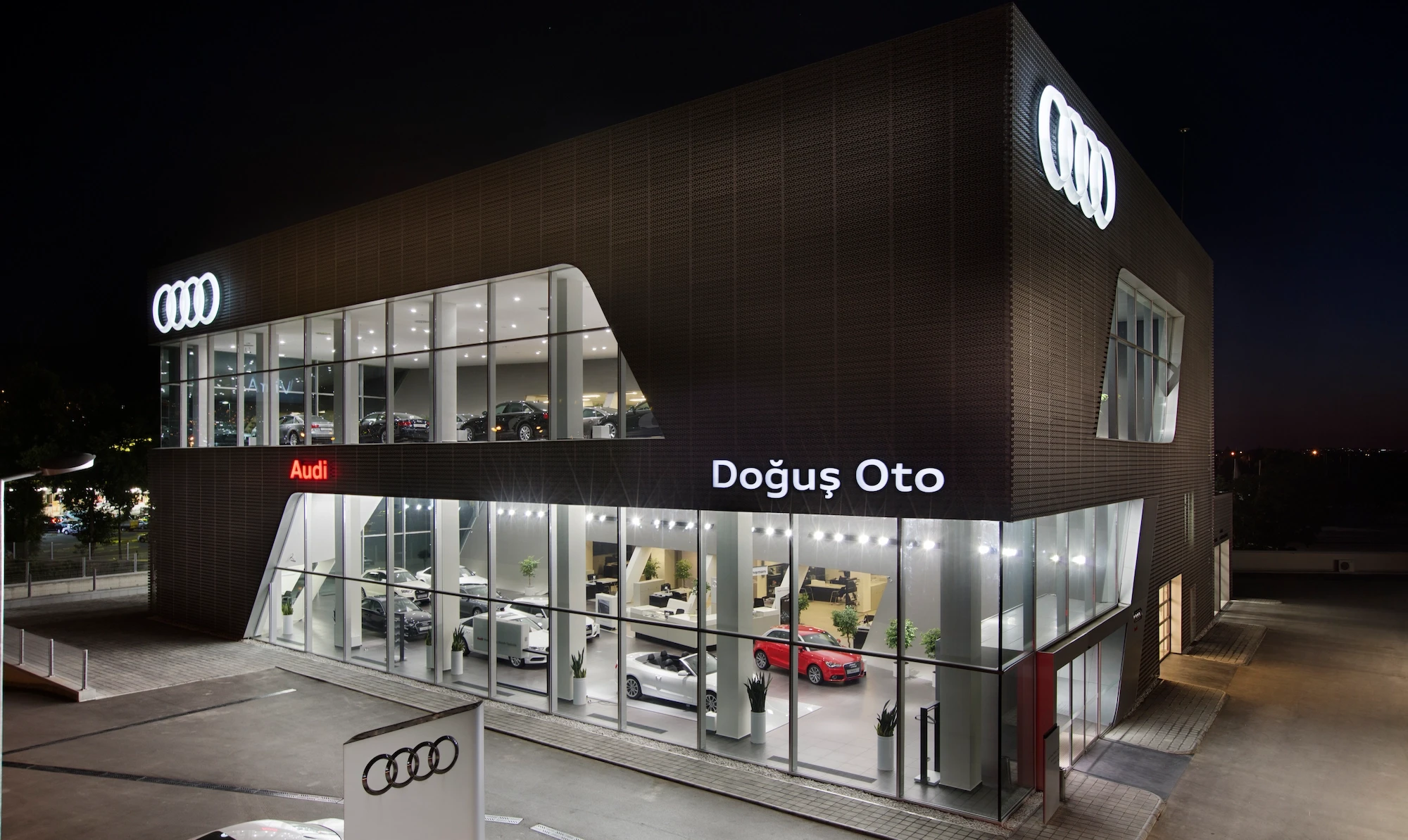 Doğuş Oto Bursa Facilities, located next to the Bursa - Yalova inter-city road, were designed as a common synergy area where 4 brands with different corporate identities come together in the same campus. Vehicle display structures are planned on the platform, and common service areas are planned below so that the perception of the environment is at the highest level.