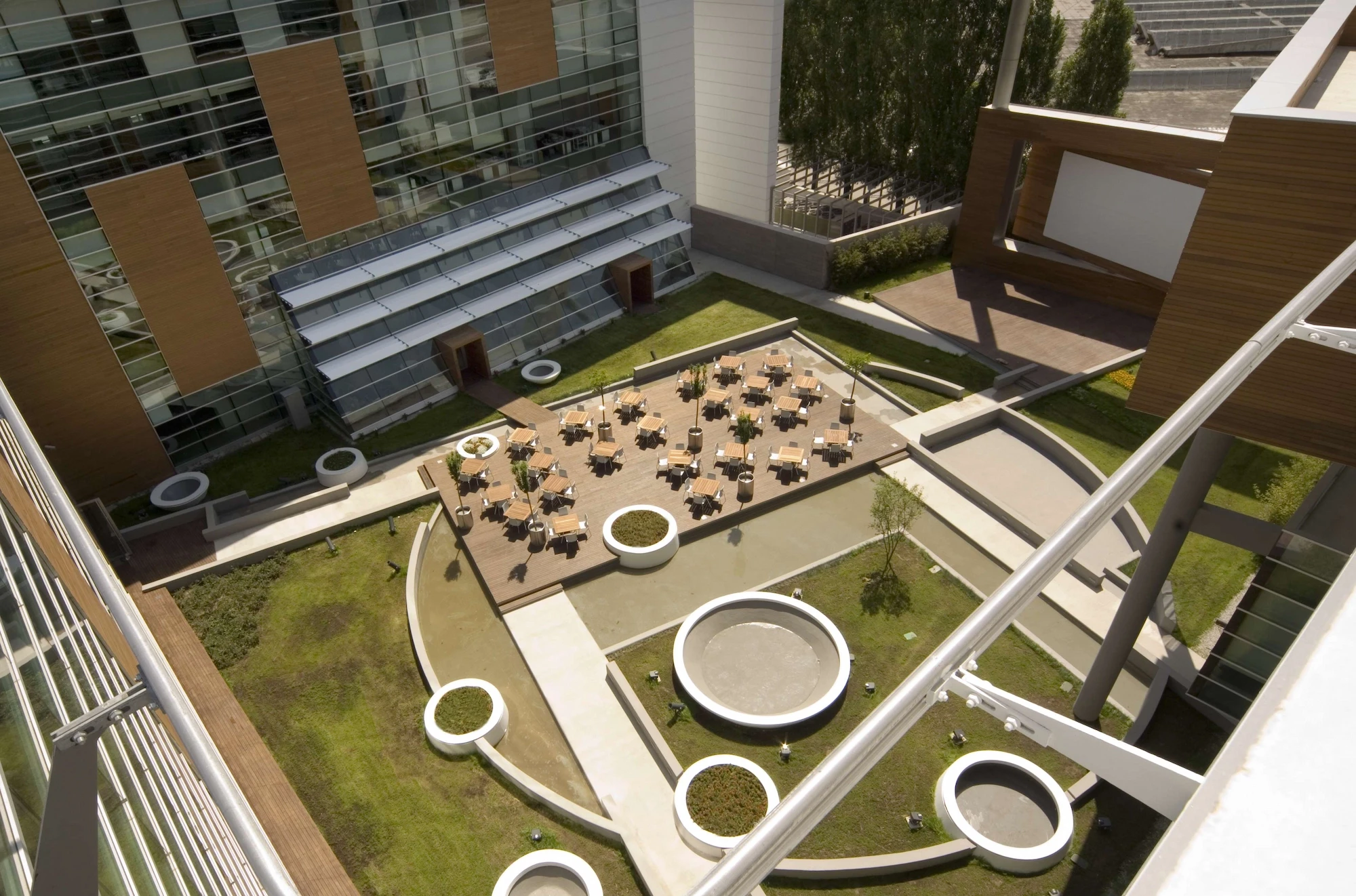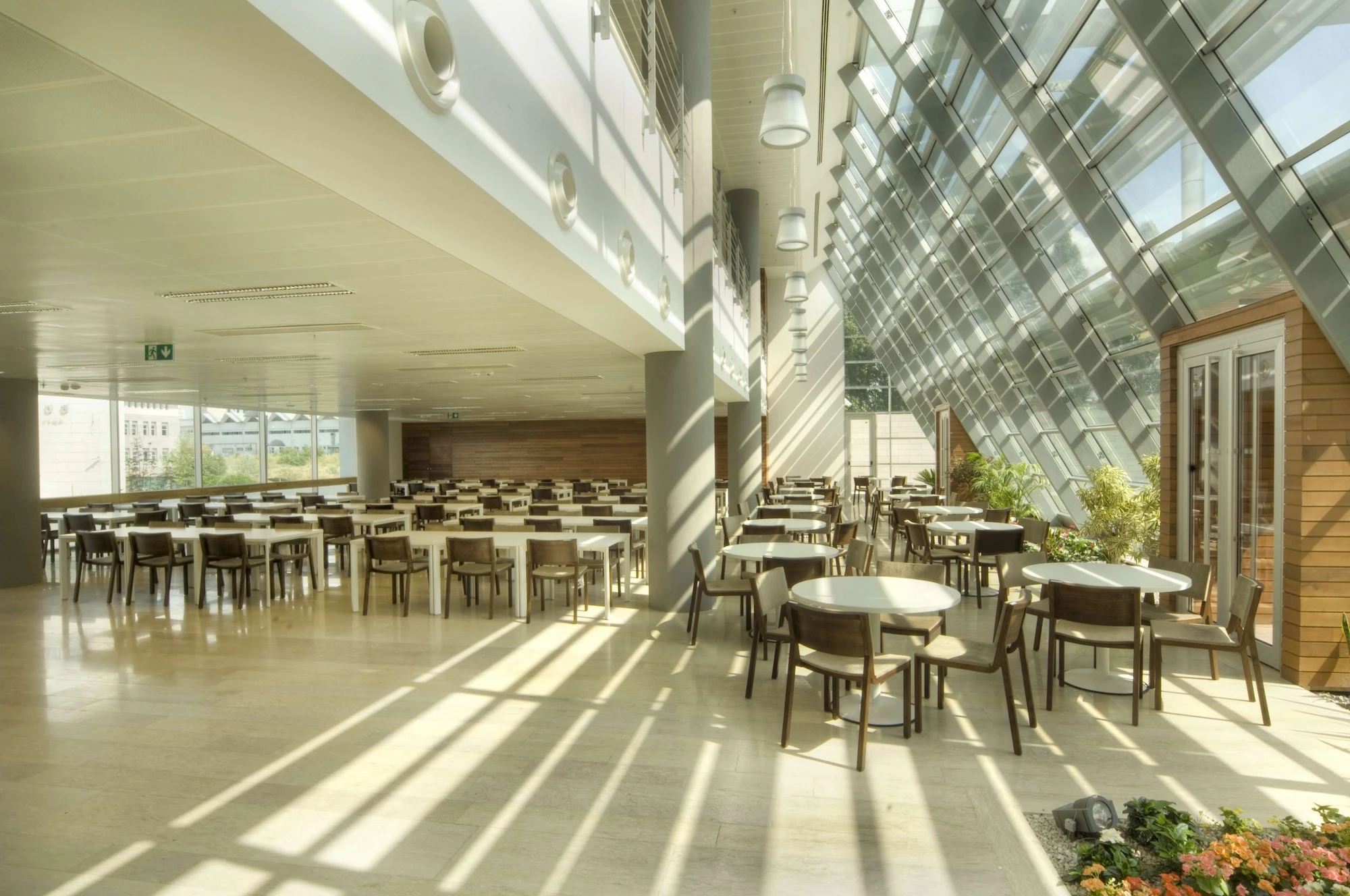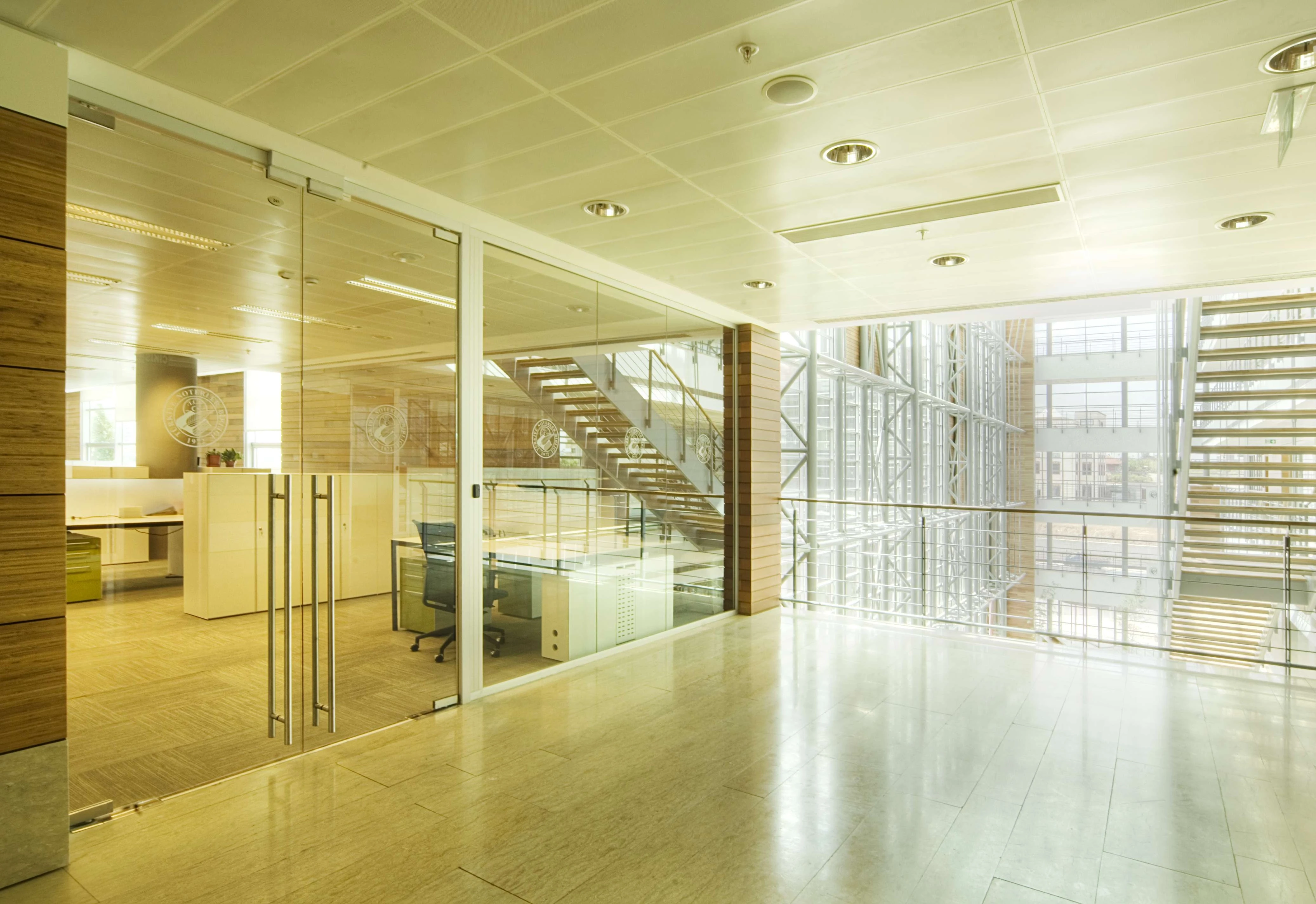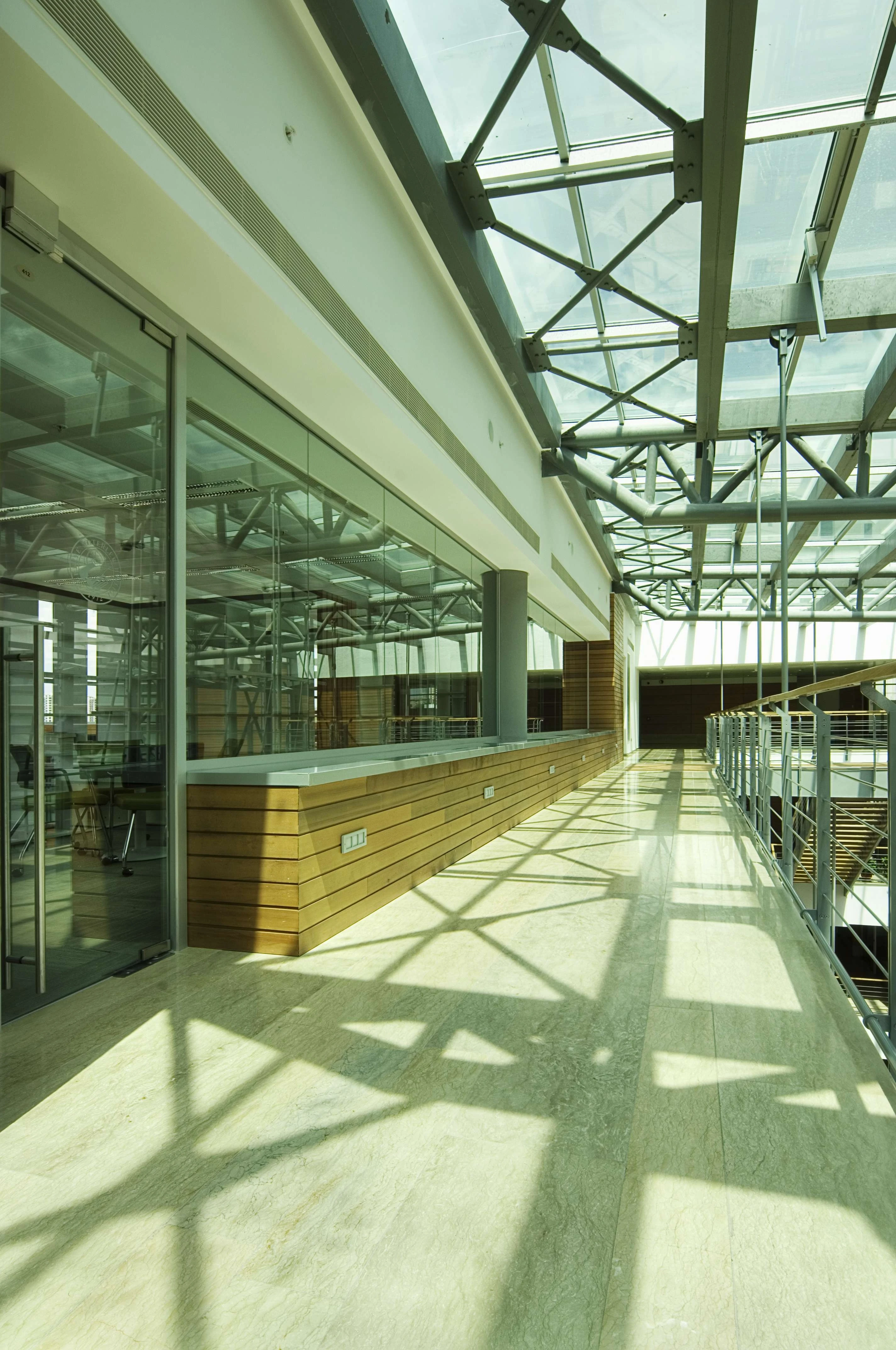 The atrium, consisting of the conference hall foyer, the entrance, the exhibition hall, and the floor bridges, forms a visual and functional mass connecting the social and the working areas with the interior garden. The clarity of the building planning openness to perception, provision for continuity between the spaces and transparency are factors that were constantly highlighted at each stage of design.