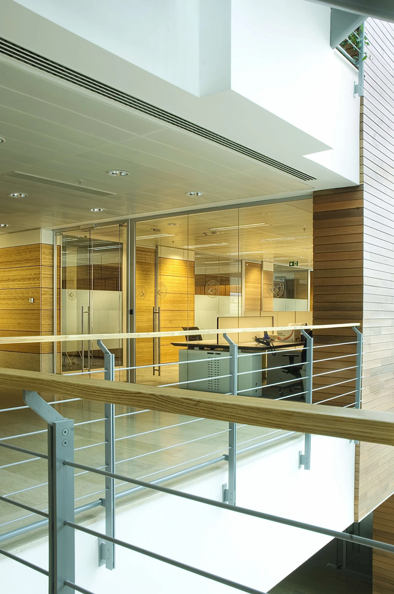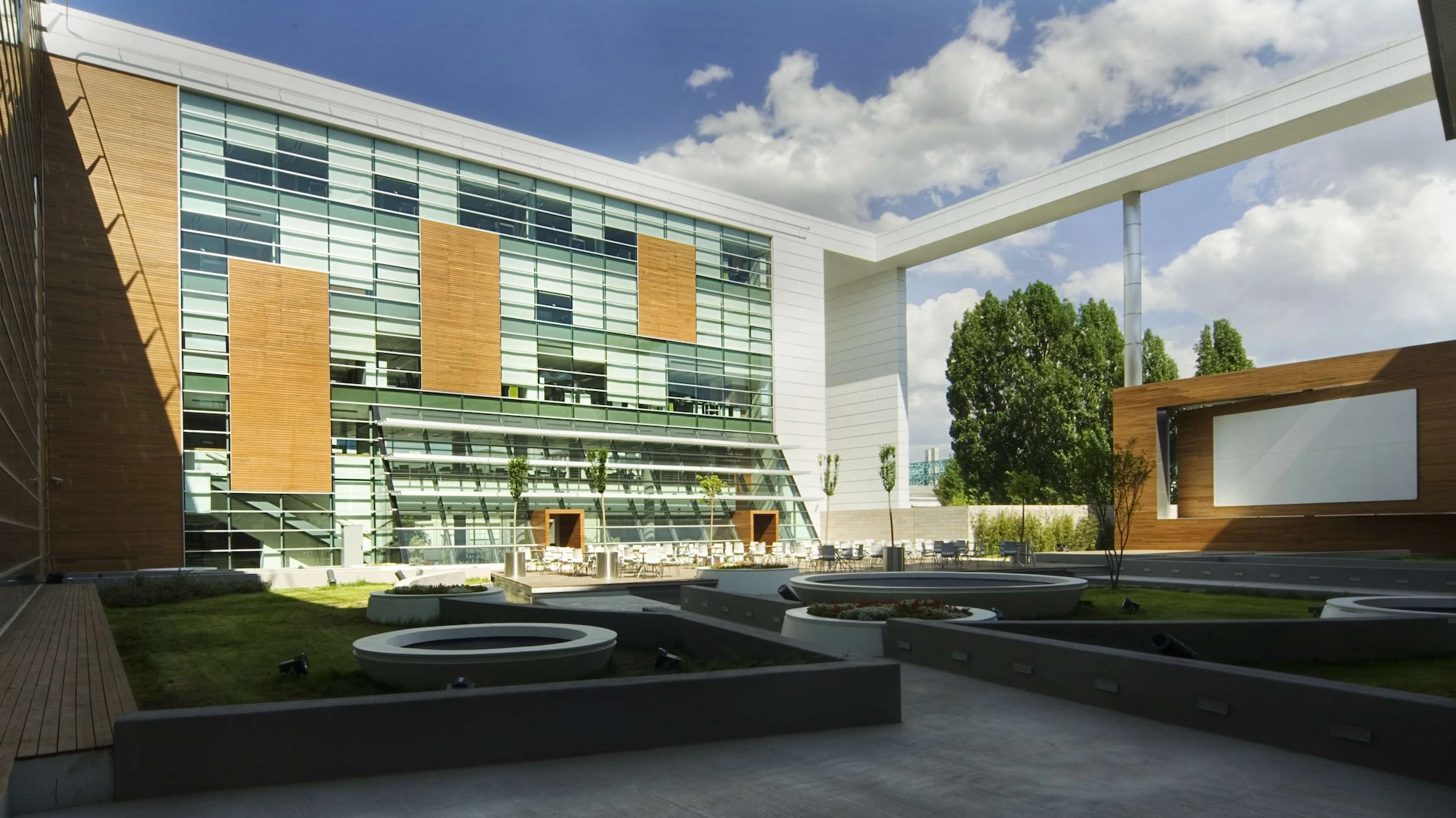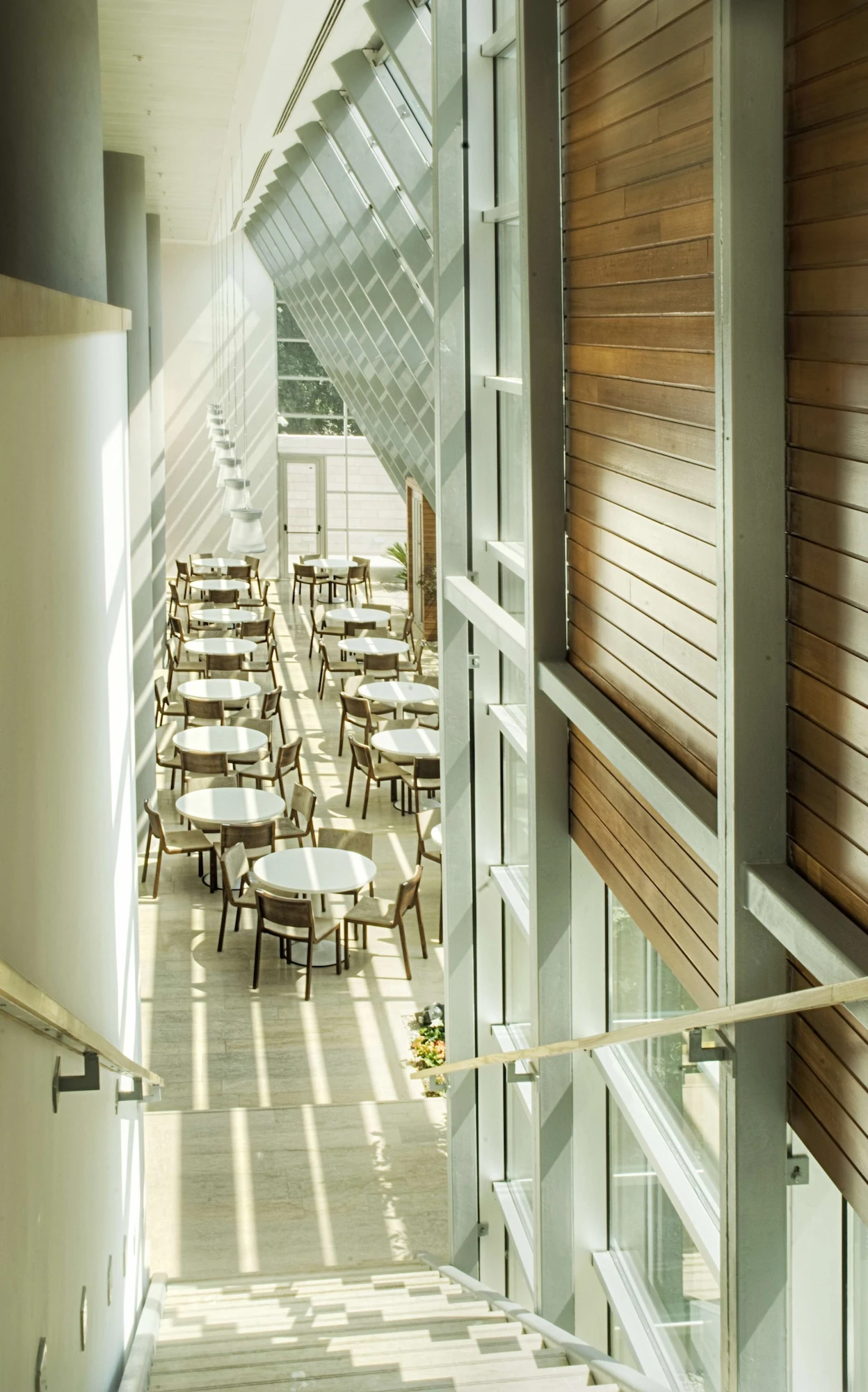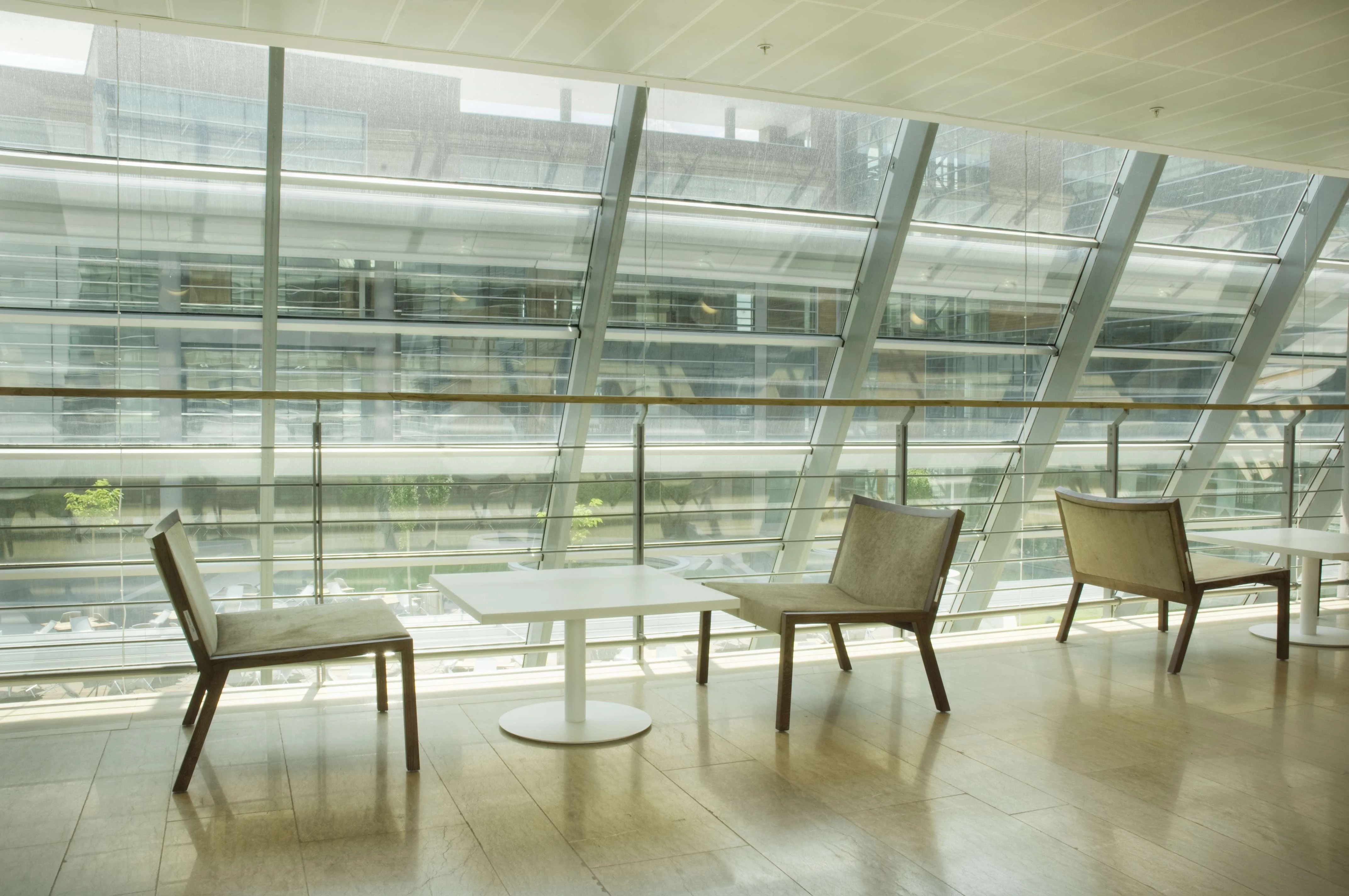 The atrium, consisting of the conference hall foyer, the entrance, the exhibition hall, and the floor bridges, forms a visual and functional mass connecting the social and the working areas with the interior garden. The clarity of the building planning openness to perception, provision for continuity between the spaces and transparency are factors that were constantly highlighted at each stage of design.