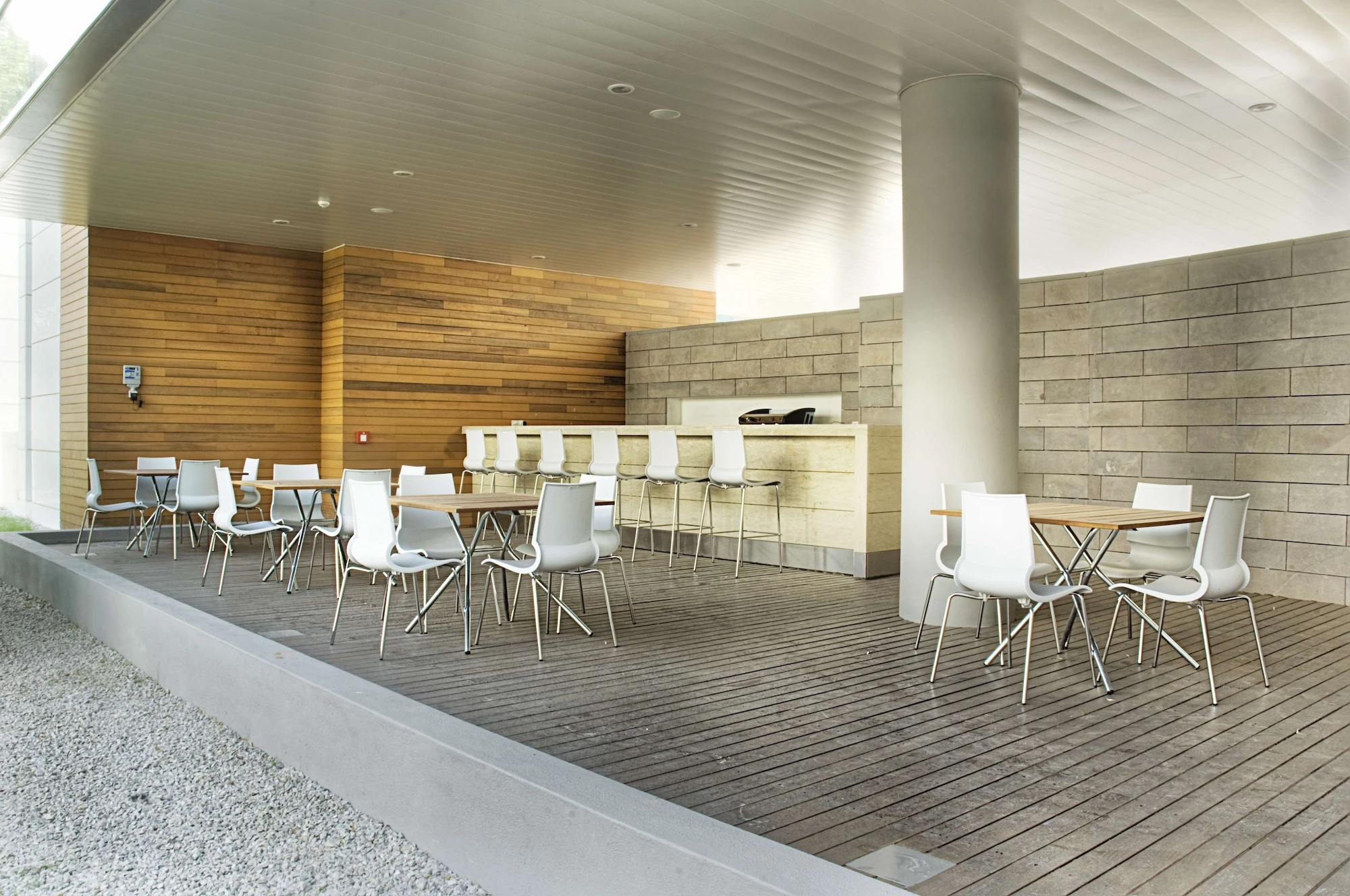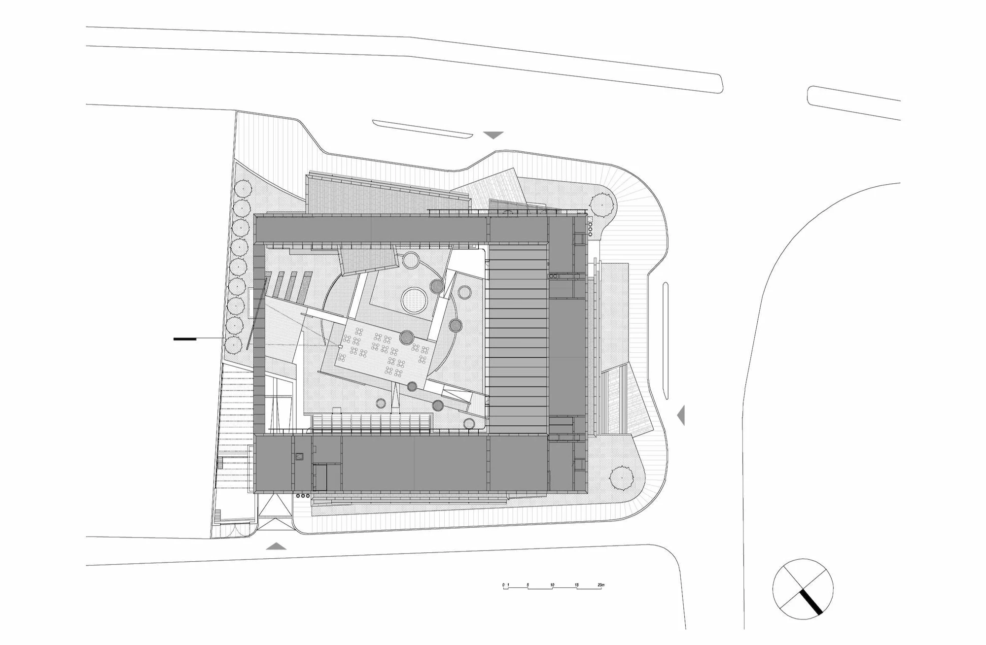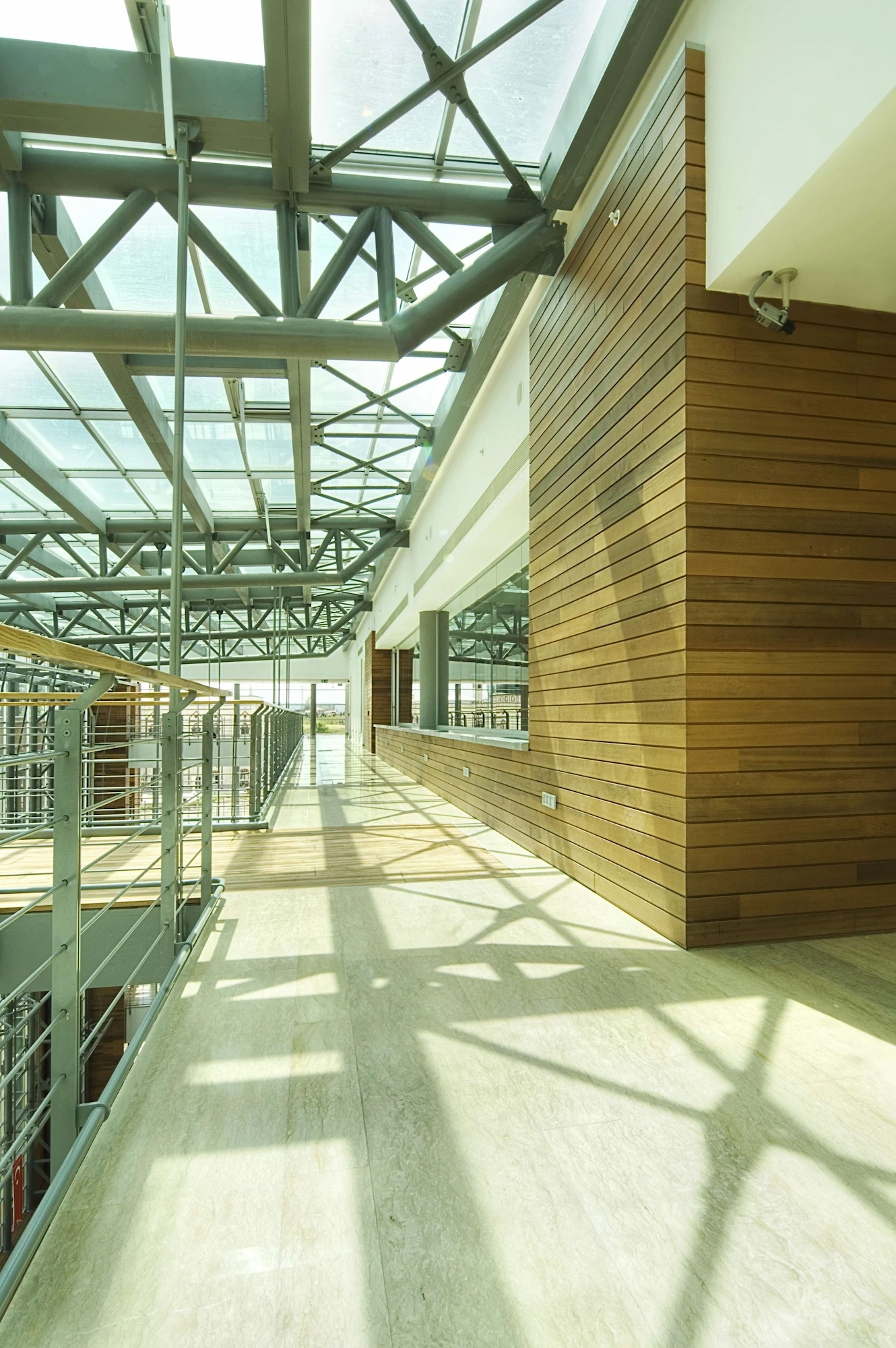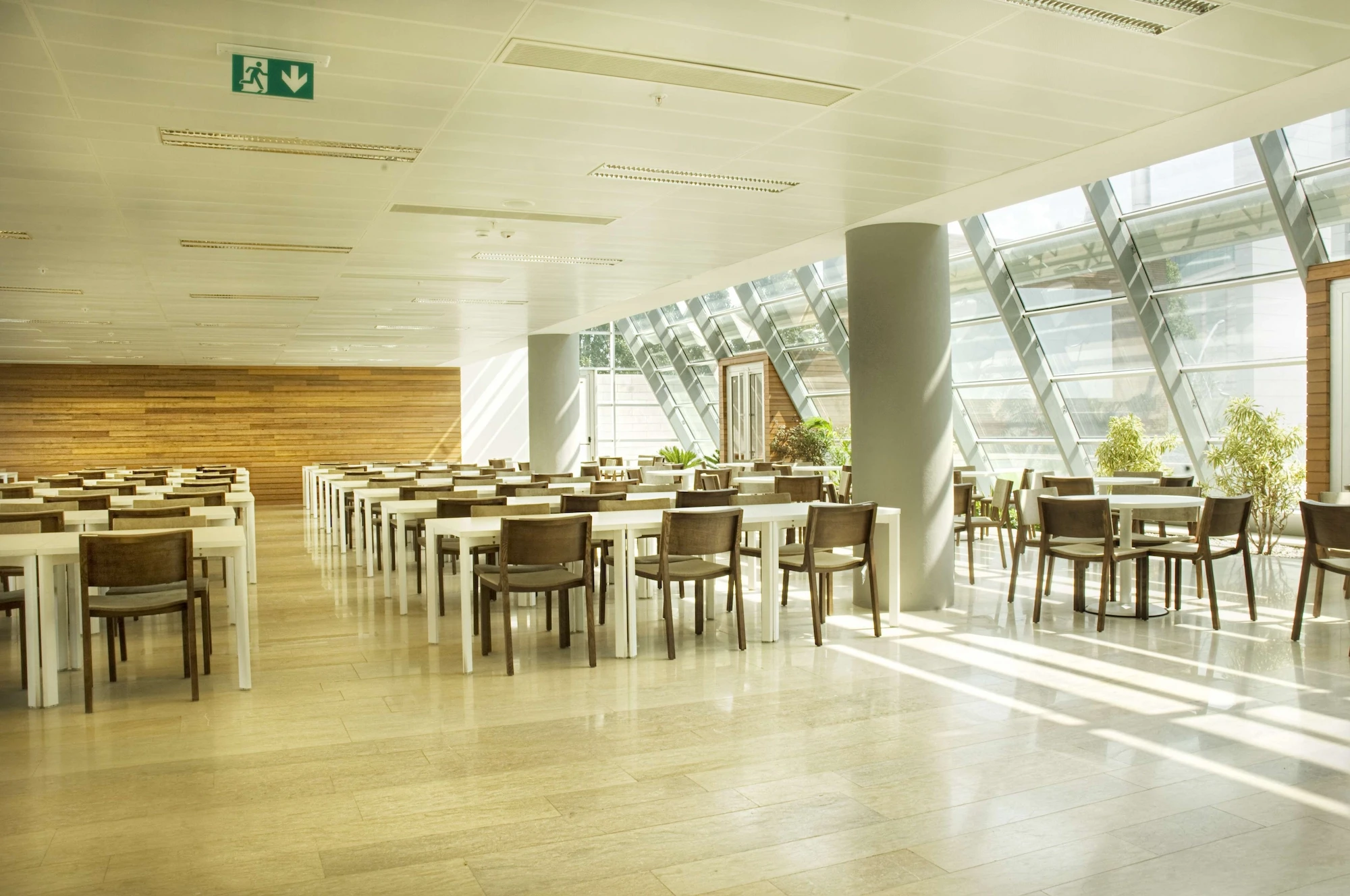 The atrium, consisting of the conference hall foyer, the entrance, the exhibition hall, and the floor bridges, forms a visual and functional mass connecting the social and the working areas with the interior garden. The clarity of the building planning openness to perception, provision for continuity between the spaces and transparency are factors that were constantly highlighted at each stage of design.