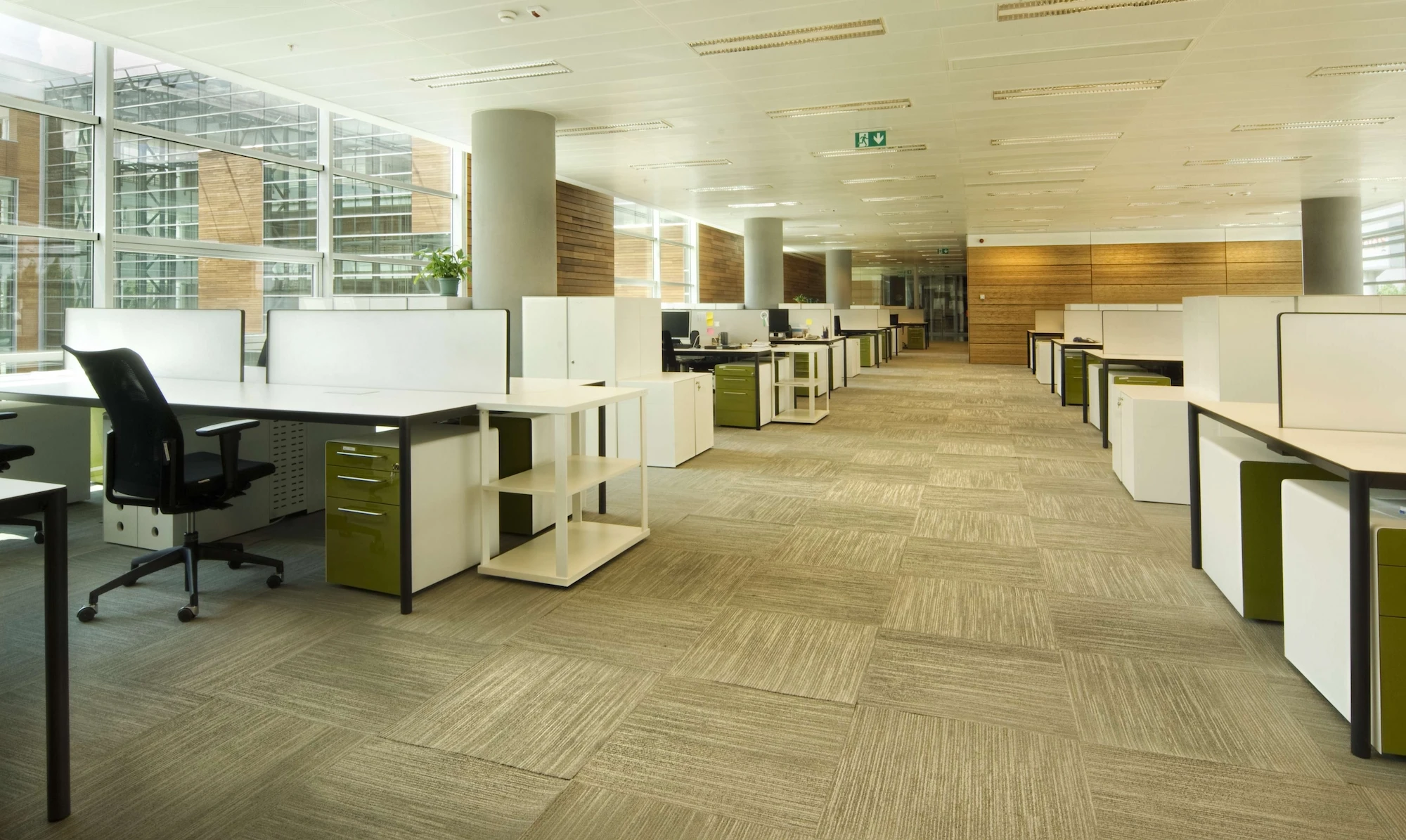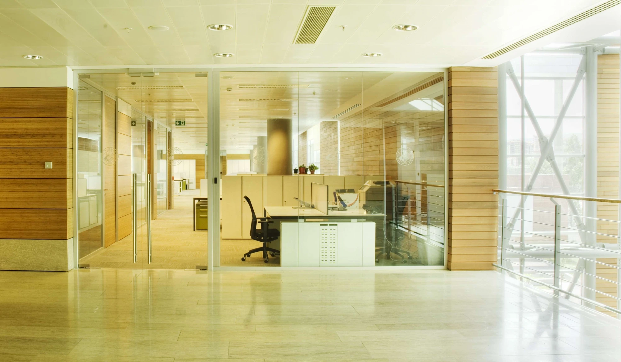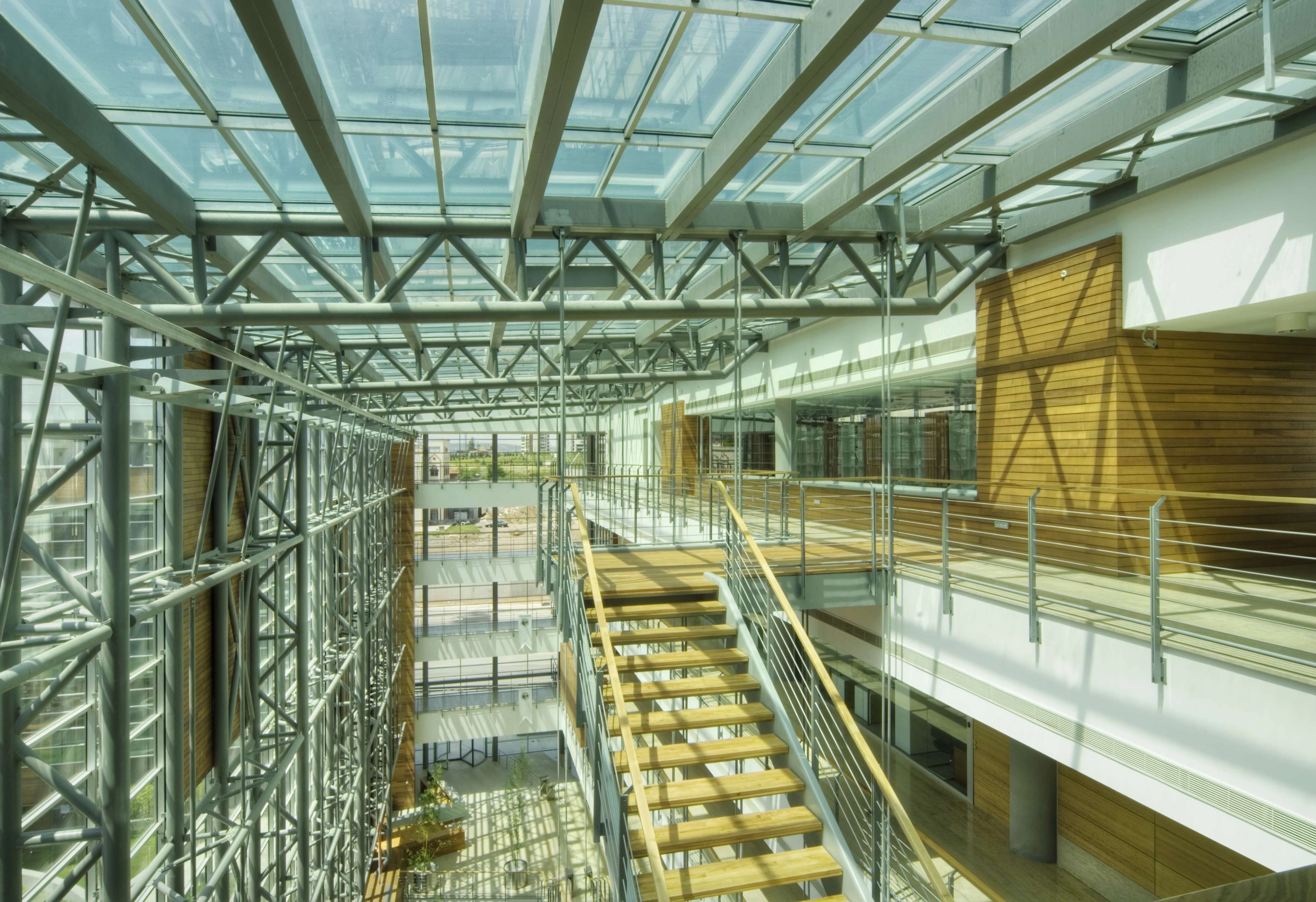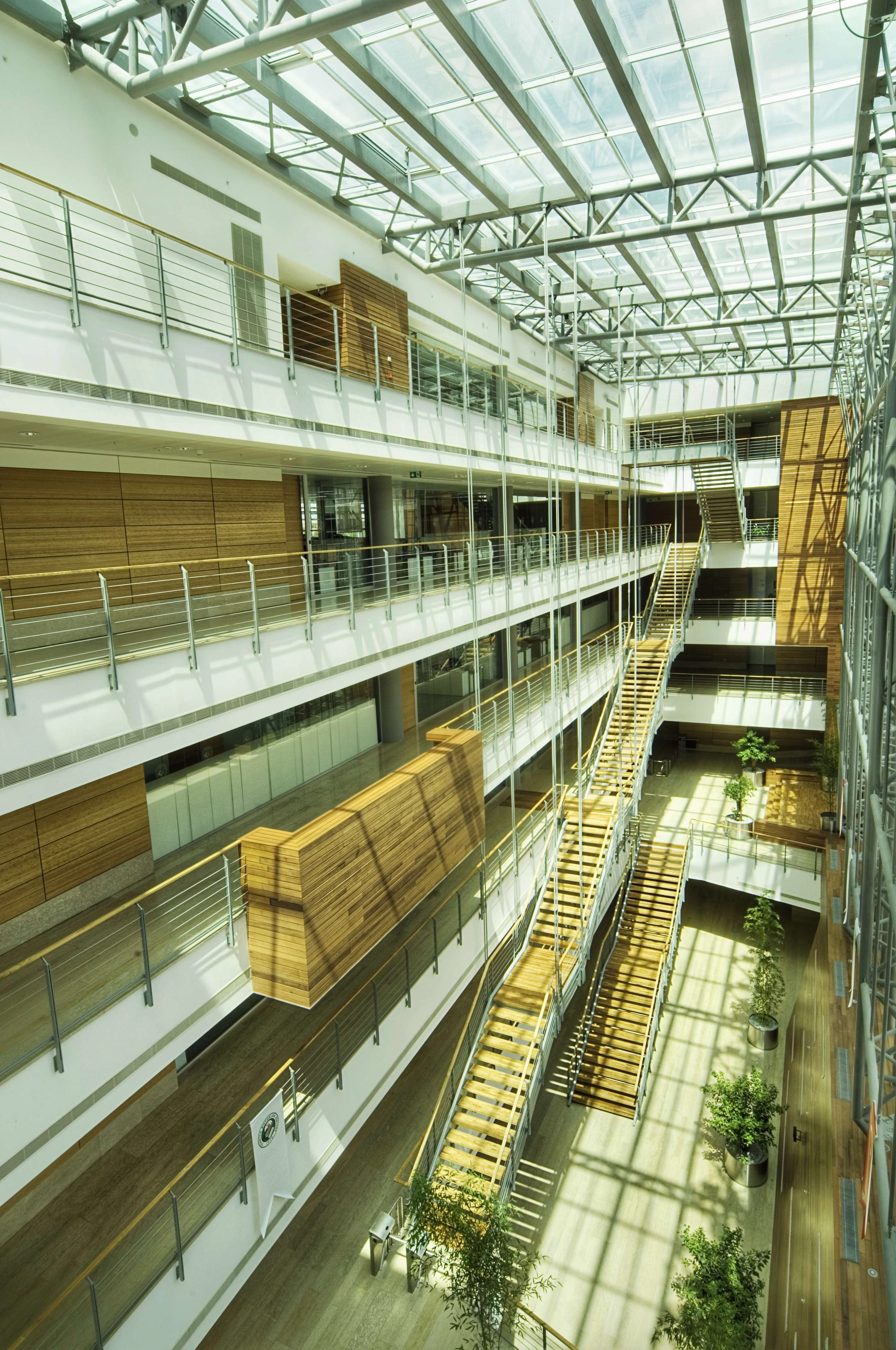An office building organized by an atrium, promoting communication and fostering a sense of community.