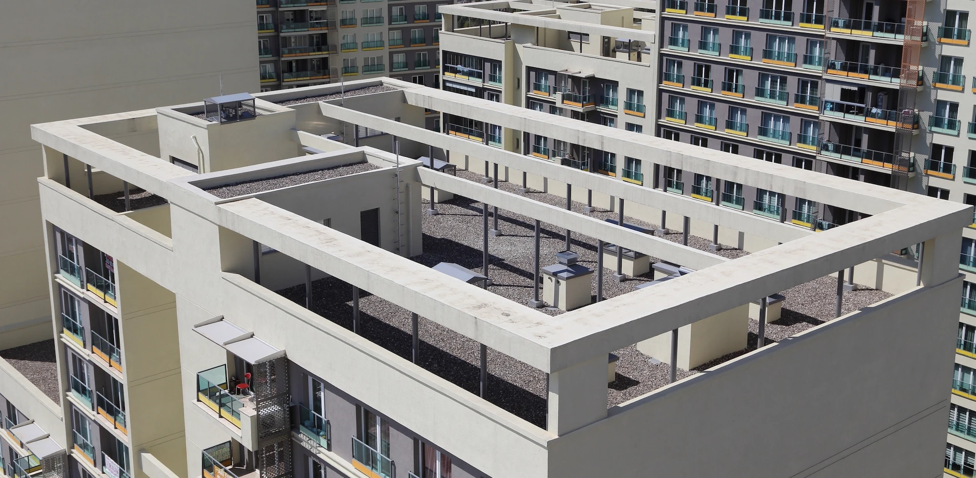 The accustomed restrictions imposed by the tunnel formwork system were given increased flexibility through innovative measures such as gaps in the structural mass, broad spans, and consoles. Monotony due to the repetitious façade arrangement and the continuity of the grid composition was avoided by the use of differing materials and ratios of color and filled-empty areas, lending the buildings an artistic texture.