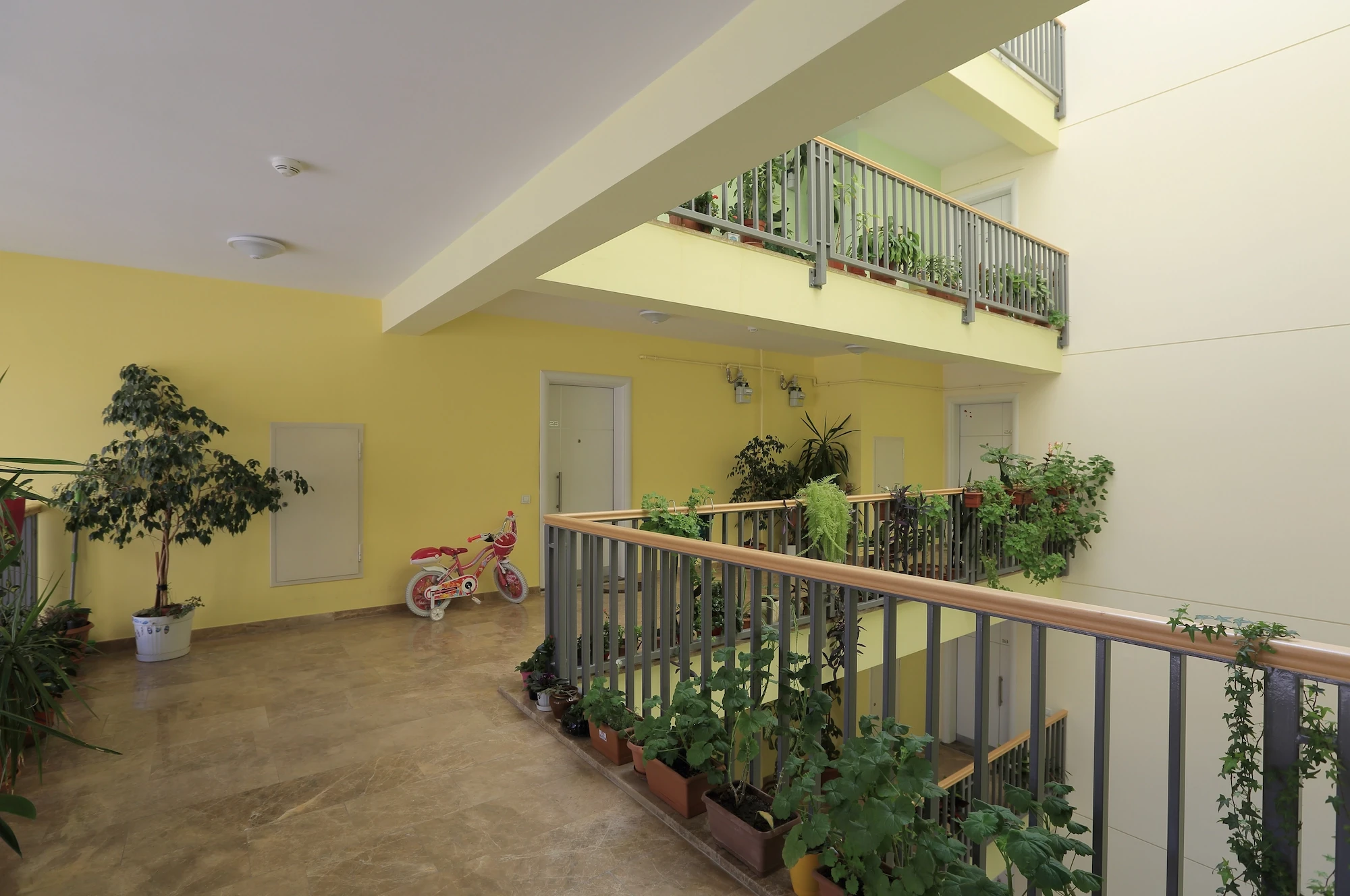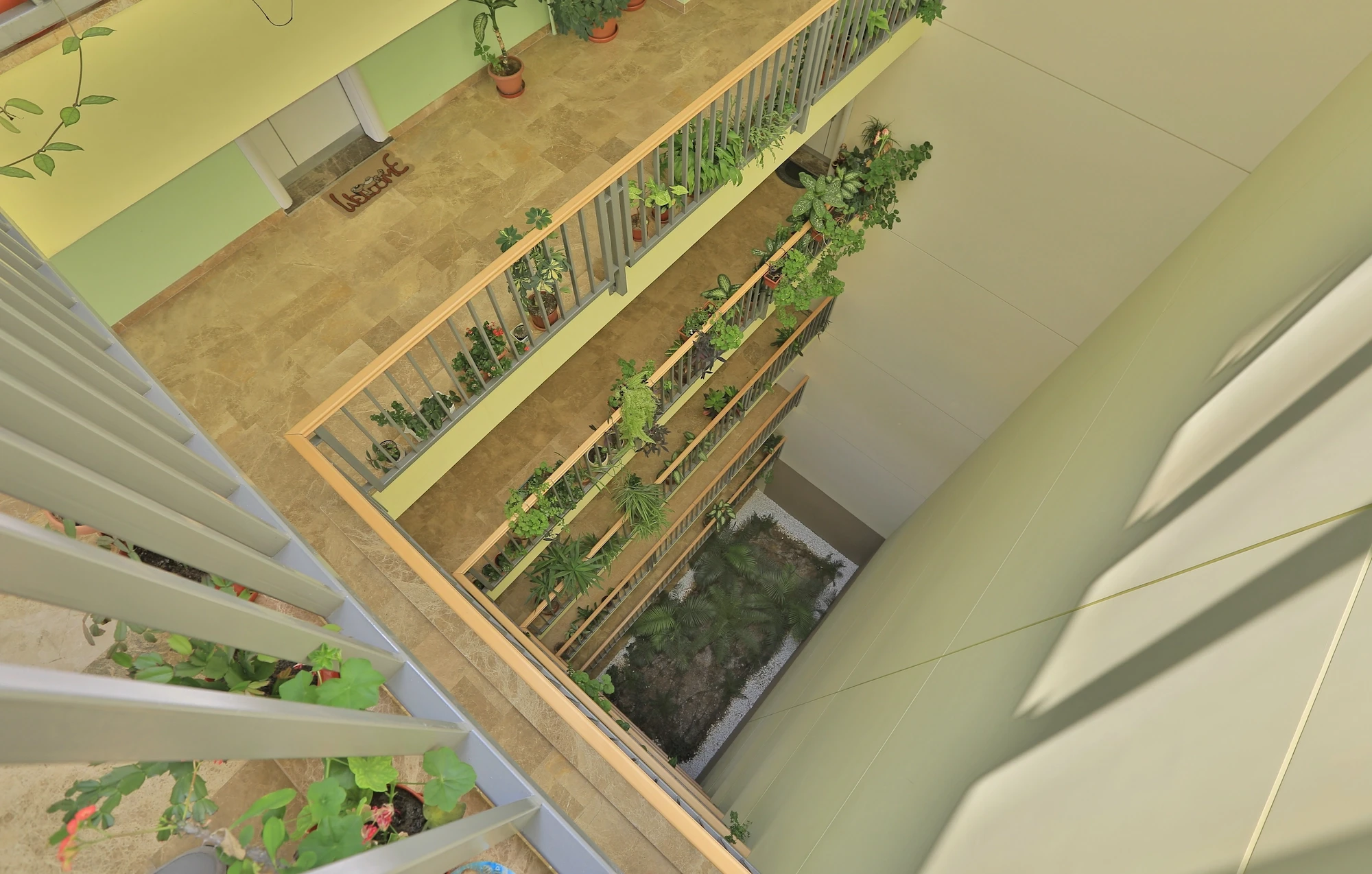 Throughout the project, the landings were treated as transitional spaces between public and private life. In all the blocks the landings open onto the façade, so admitting daylight and giving them the character of living spaces. Empty gallery spaces and light wells are intended to lend interest to the landings as spaces and reinforce neighborly relations. This layout, which was one of the project’s original aims, took on a concrete way of life once the complex had been constructed. It has been observed that occupants engage actively in landscaping the main transition spaces in the buildings and use them to gather and communicate with their neighbors. This indicates that the project has achieved even more than it originally set out to do in creating “environments that focus on life”.
