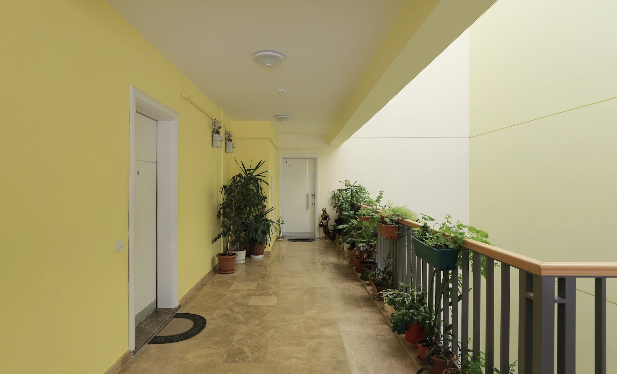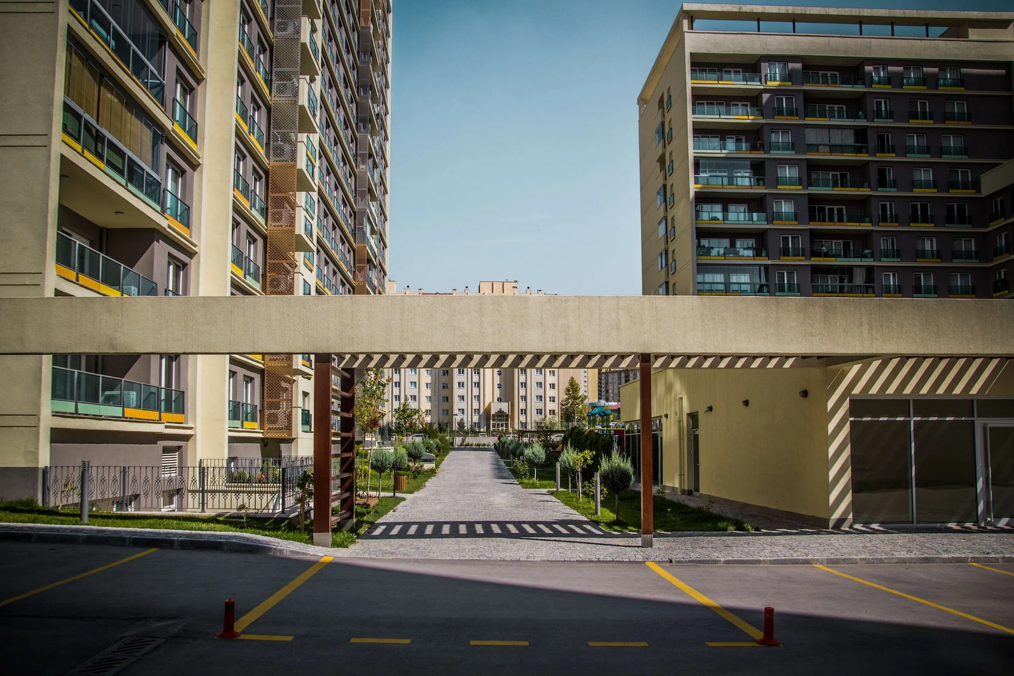 The spreading layout of the retail center on the same parcel of land resulted in increased density for the OYAK Eryaman Residences. In response to these limitations, the project was designed as adjoining blocks of different heights surrounding courtyard gardens. By restricting vehicle traffic to the periphery of the site, it was possible to create more extensive green areas between the blocks. The greenery achieved in the courtyards as a result of the courtyard-garden layout throughout the housing complex was continued in the galleries in the halls of each block.