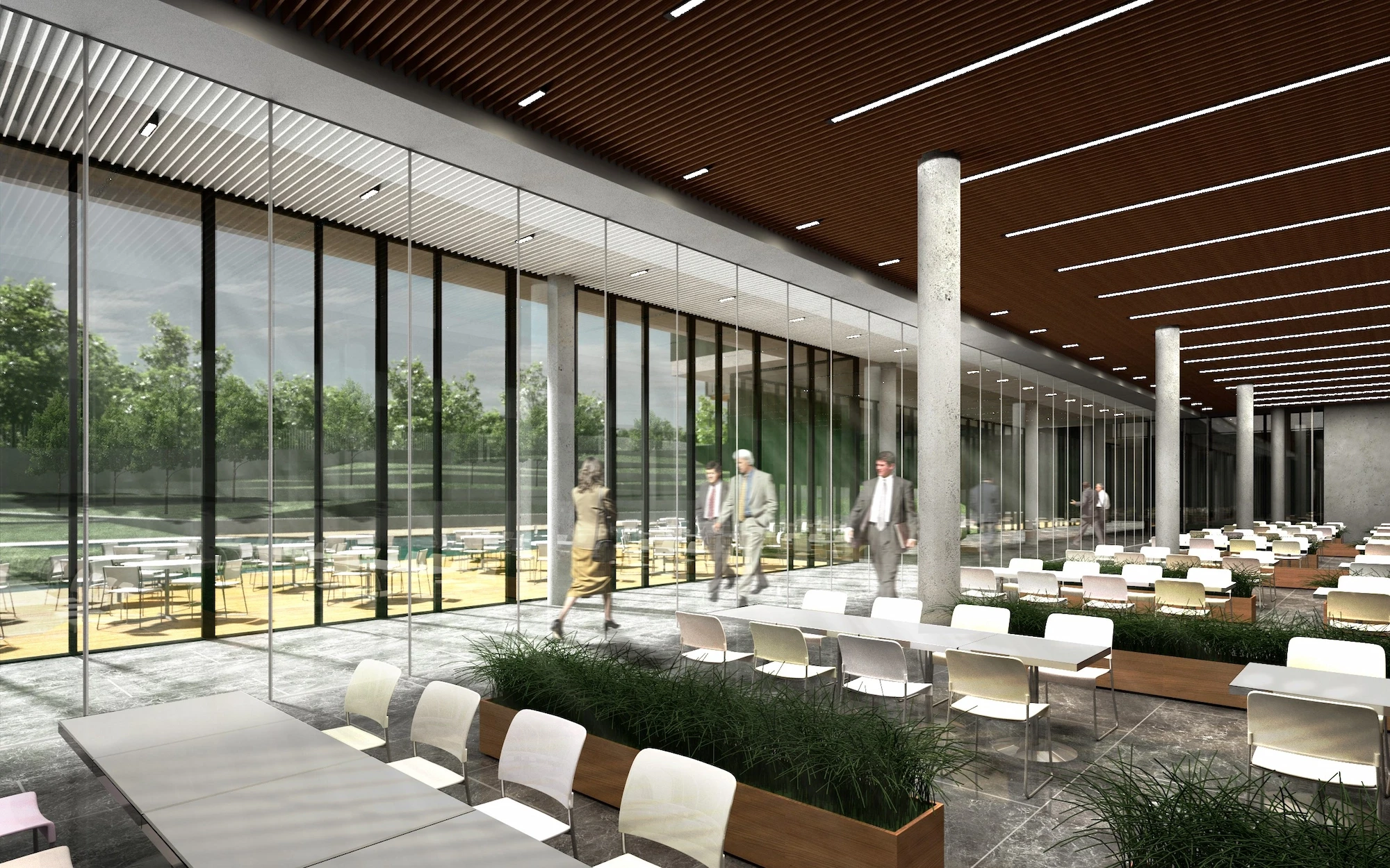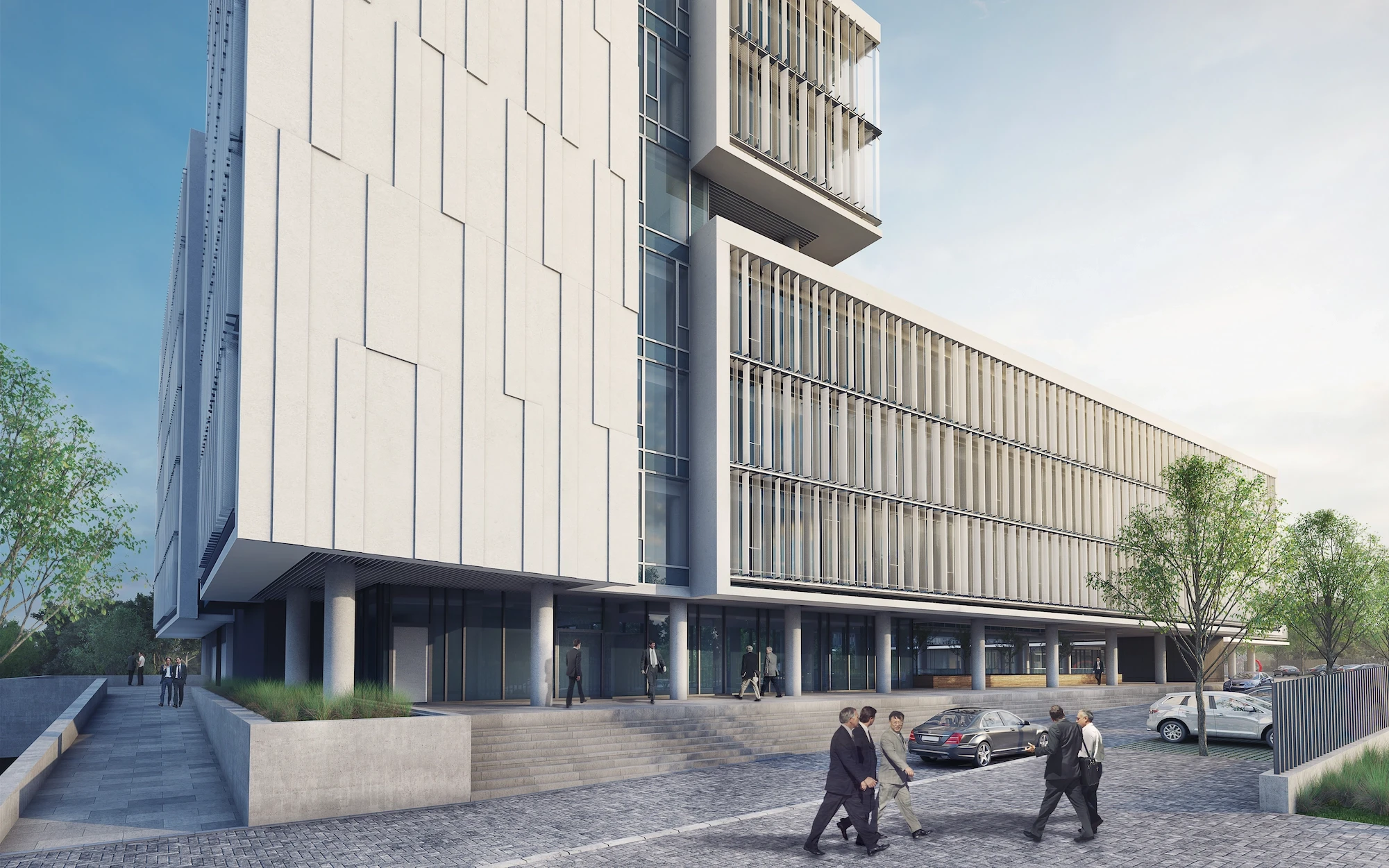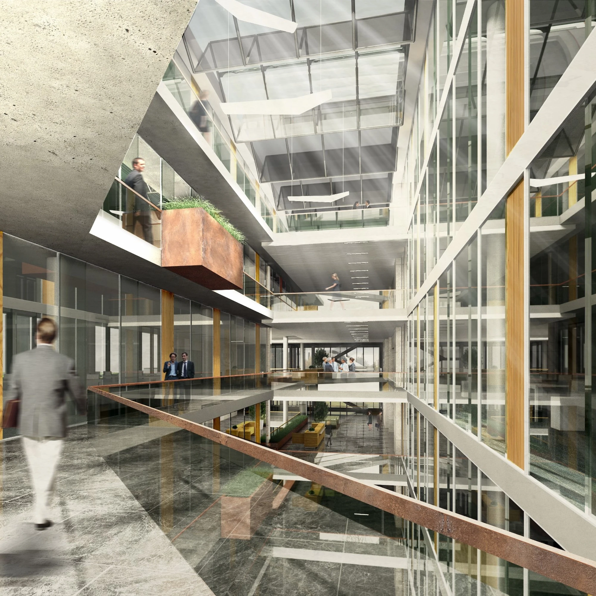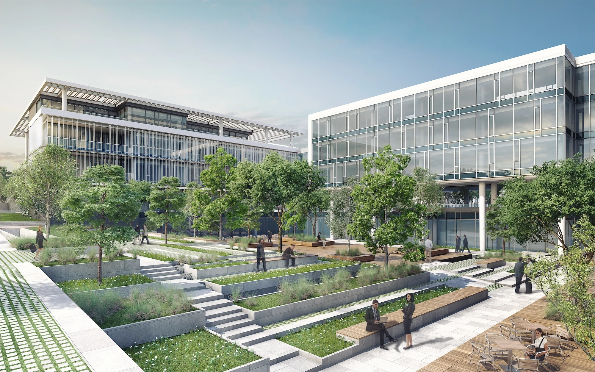 The building program has been distributed into 3 blocks of office buildings and a common social infrastructure that connects them at the base and serves as the main access to the central courtyard. The largest building, at the west end of the plot, defines the general entrance of the campus from the main road. The other two blocks, located on the east side of the plot, are connected under a “pergola”, which acts both as a sun barrier and as a distinctive architectural element that is recognized easily from a nearby environment.