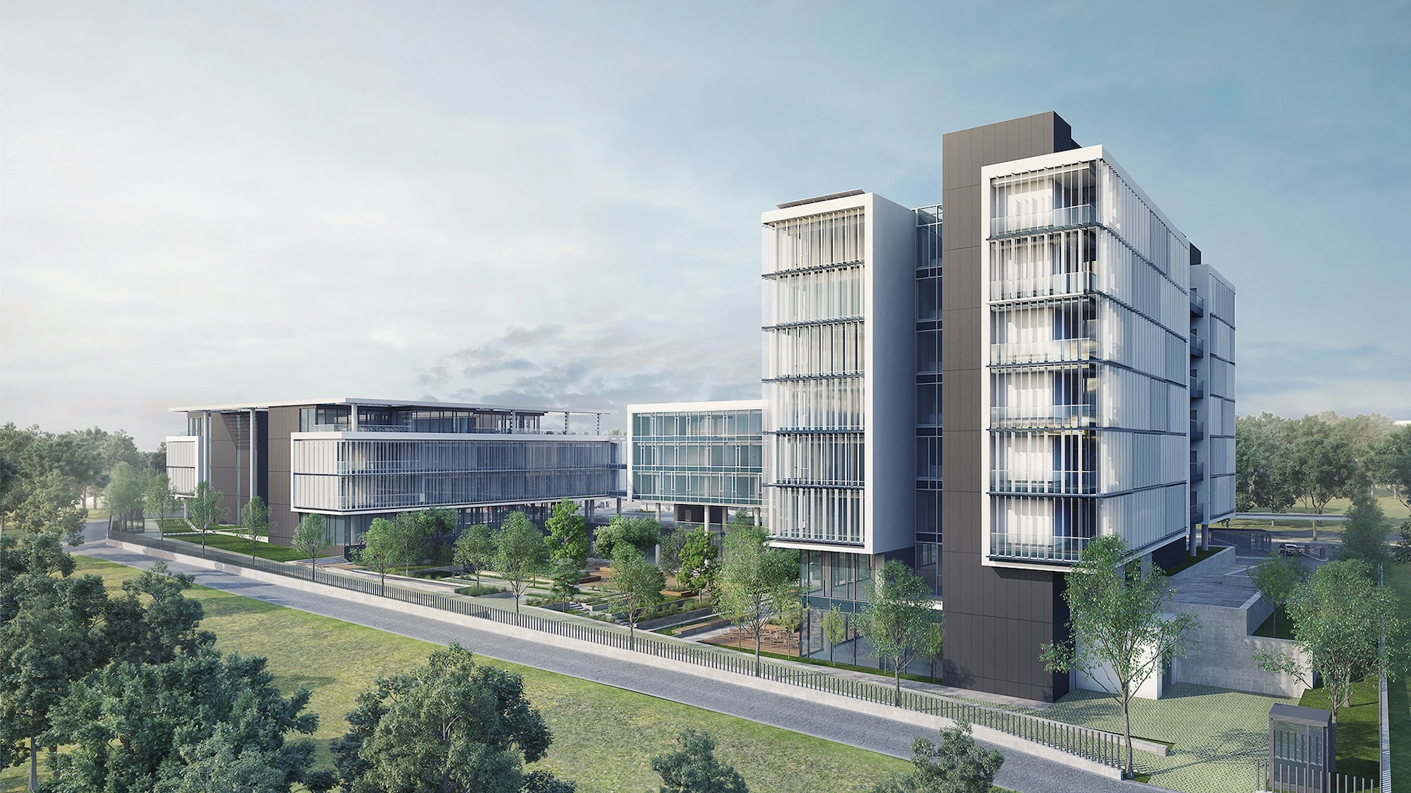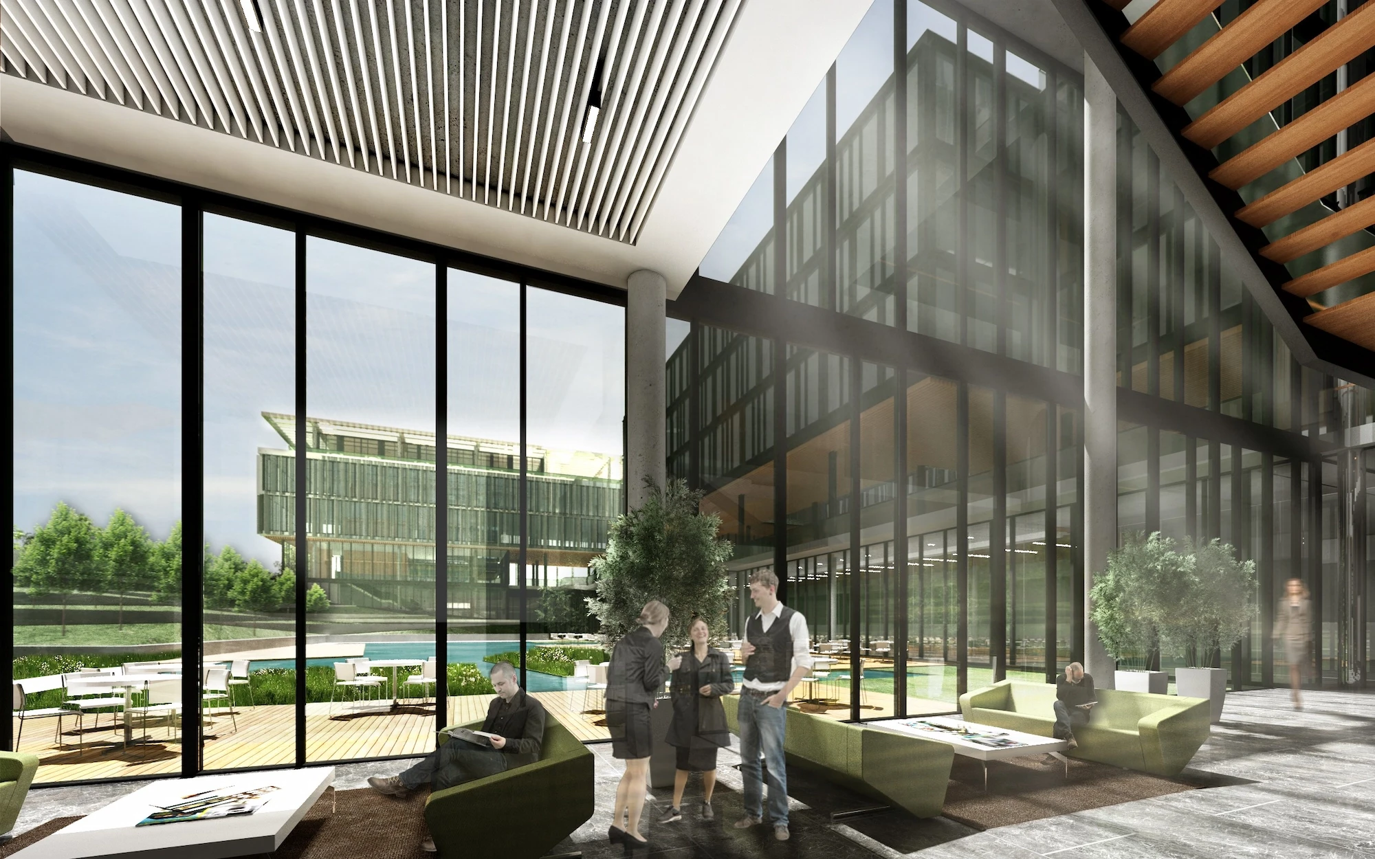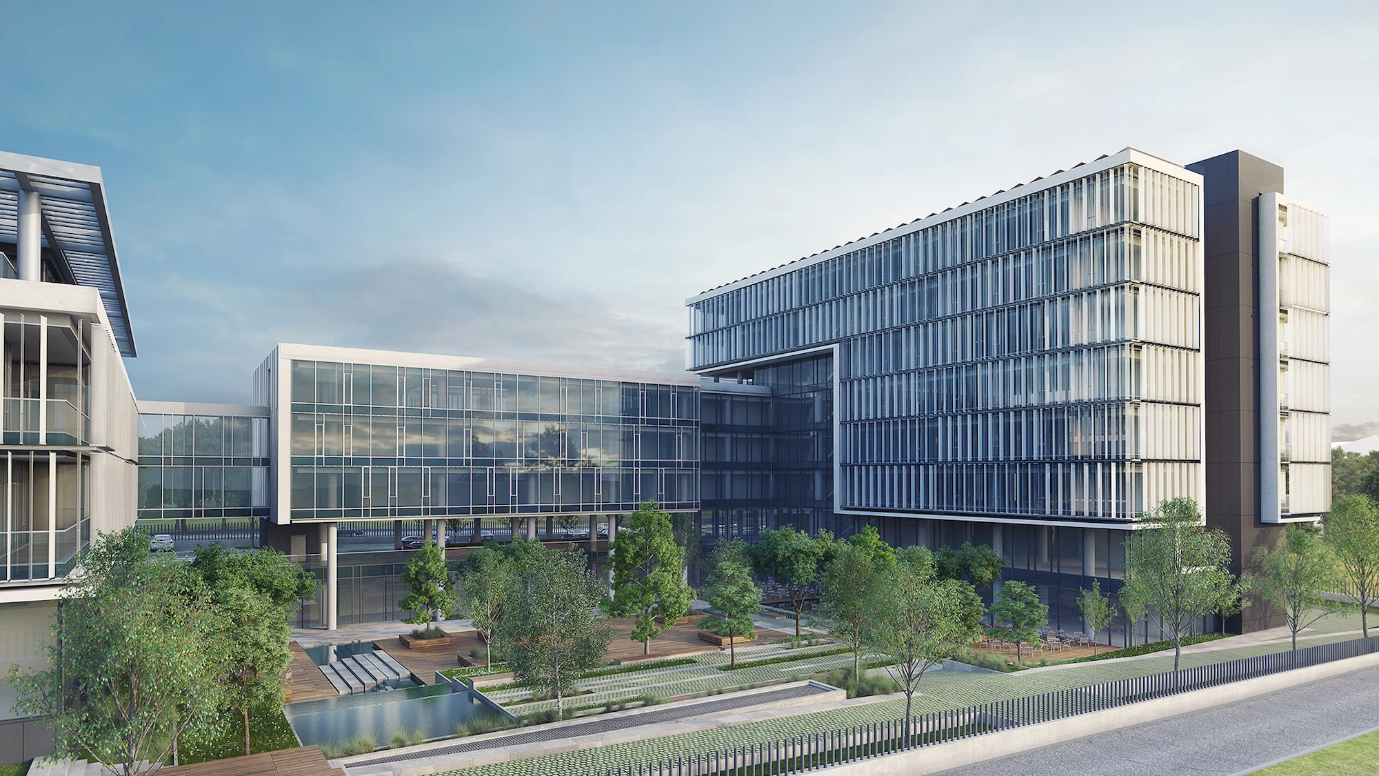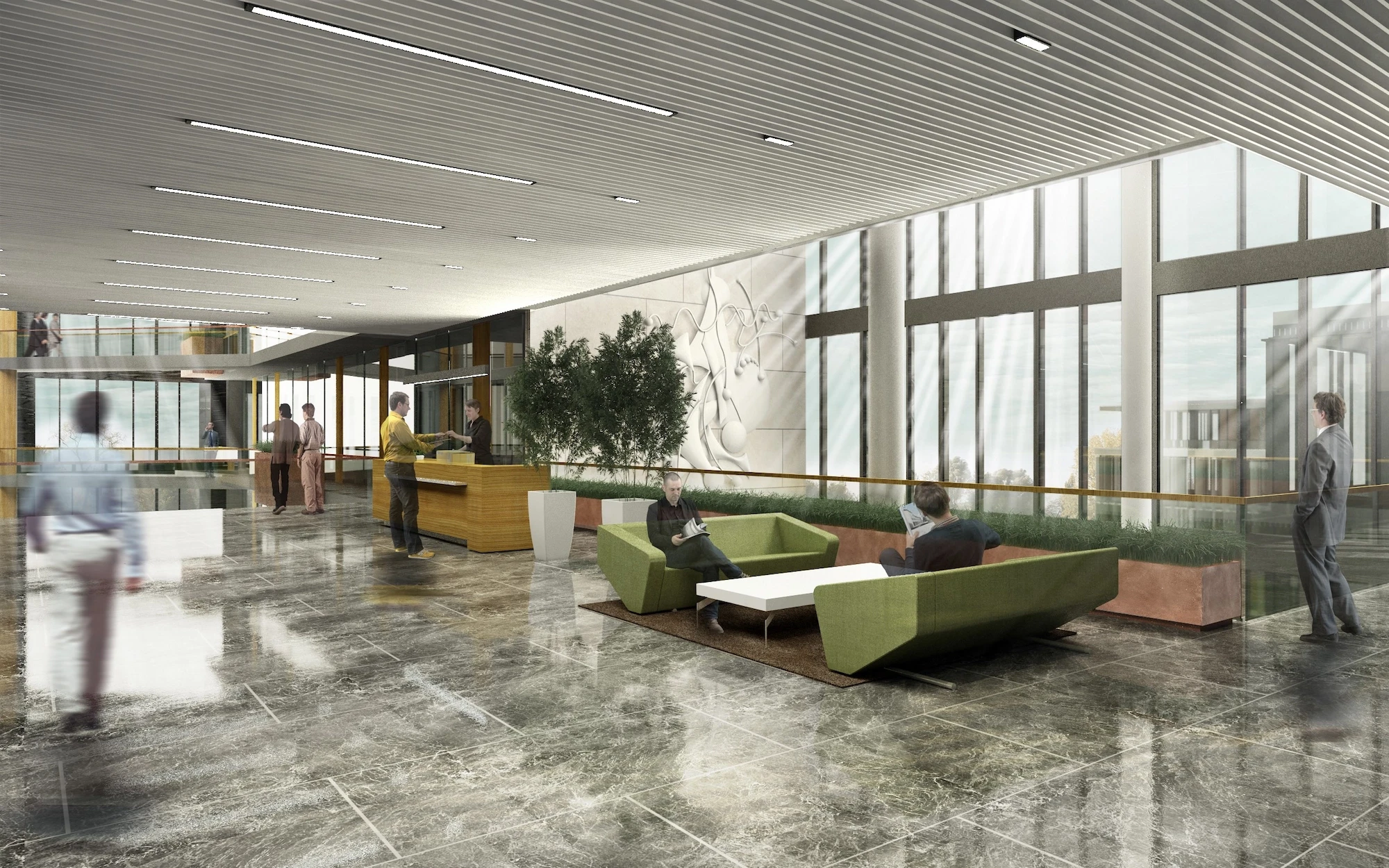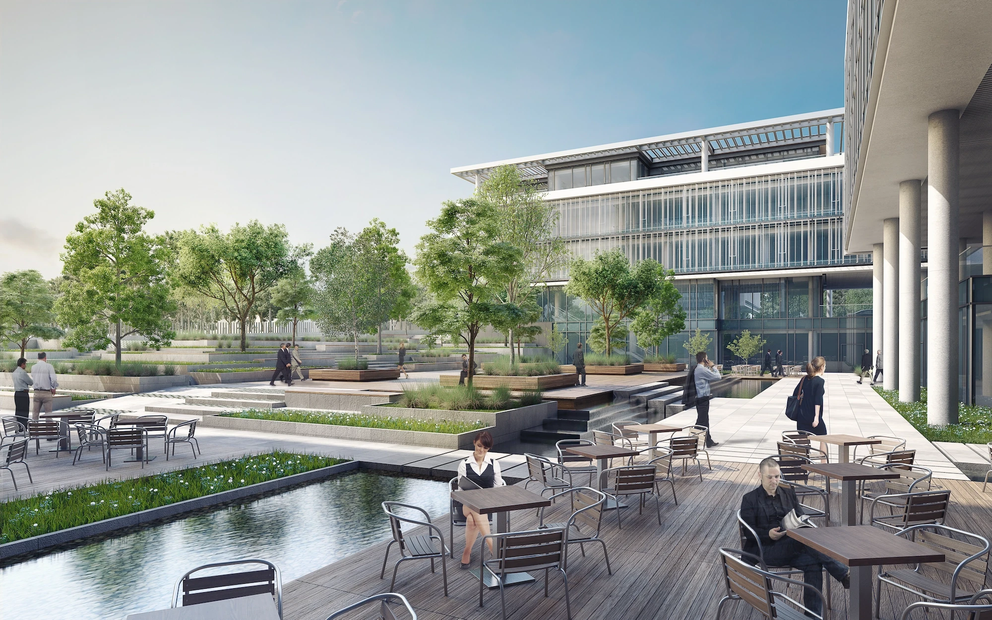 The building program has been distributed into 3 blocks of office buildings and a common social infrastructure that connects them at the base and serves as the main access to the central courtyard. The largest building, at the west end of the plot, defines the general entrance of the campus from the main road. The other two blocks, located on the east side of the plot, are connected under a “pergola”, which acts both as a sun barrier and as a distinctive architectural element that is recognized easily from a nearby environment.