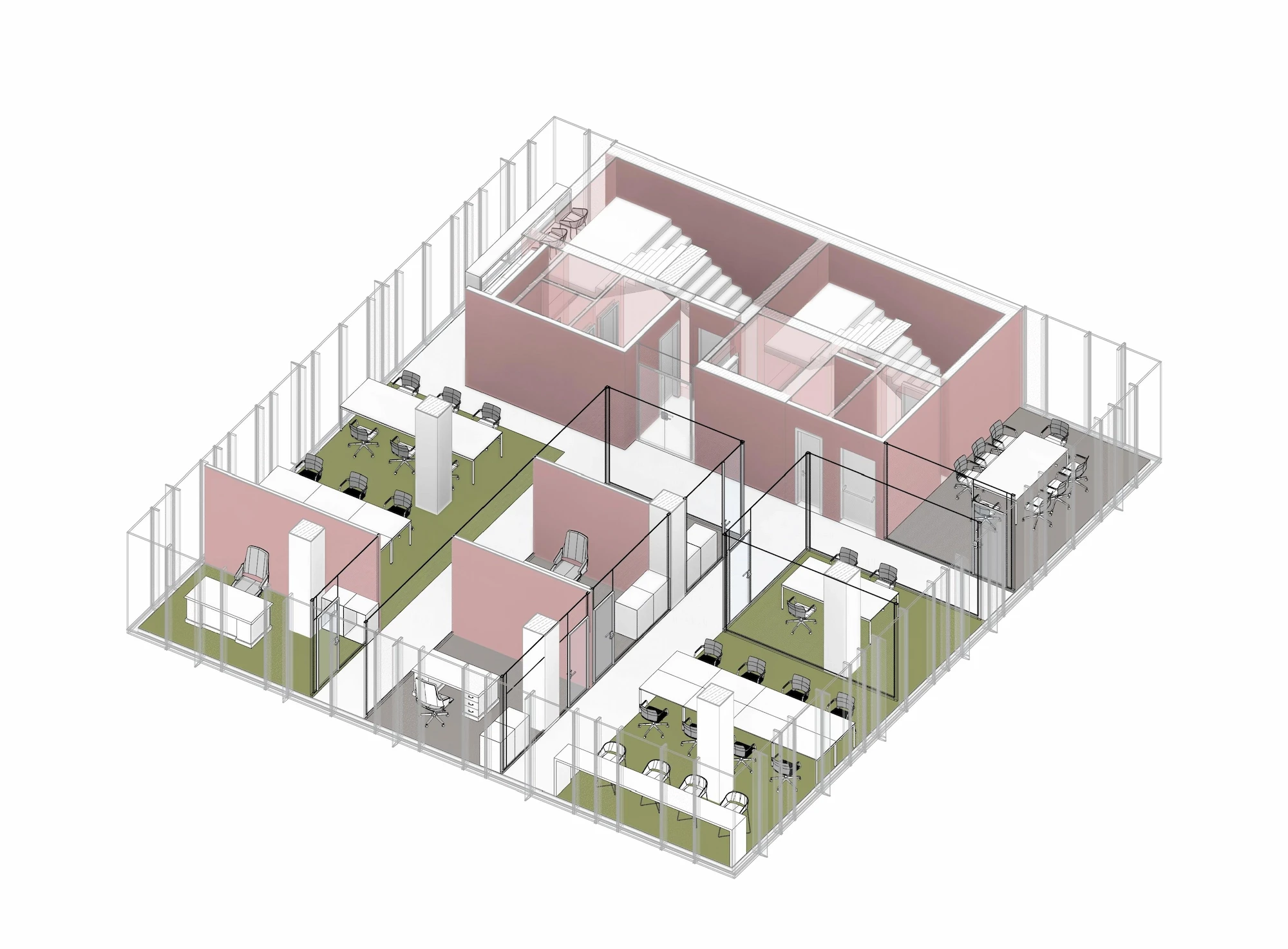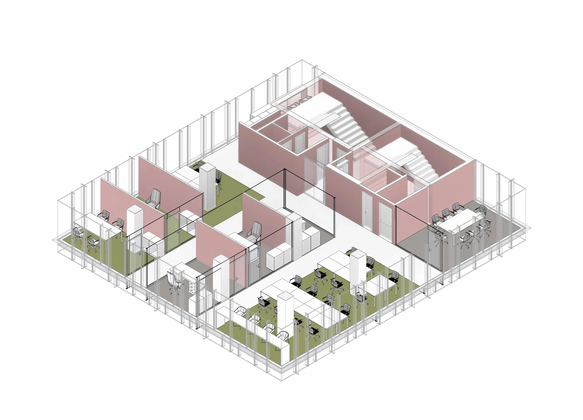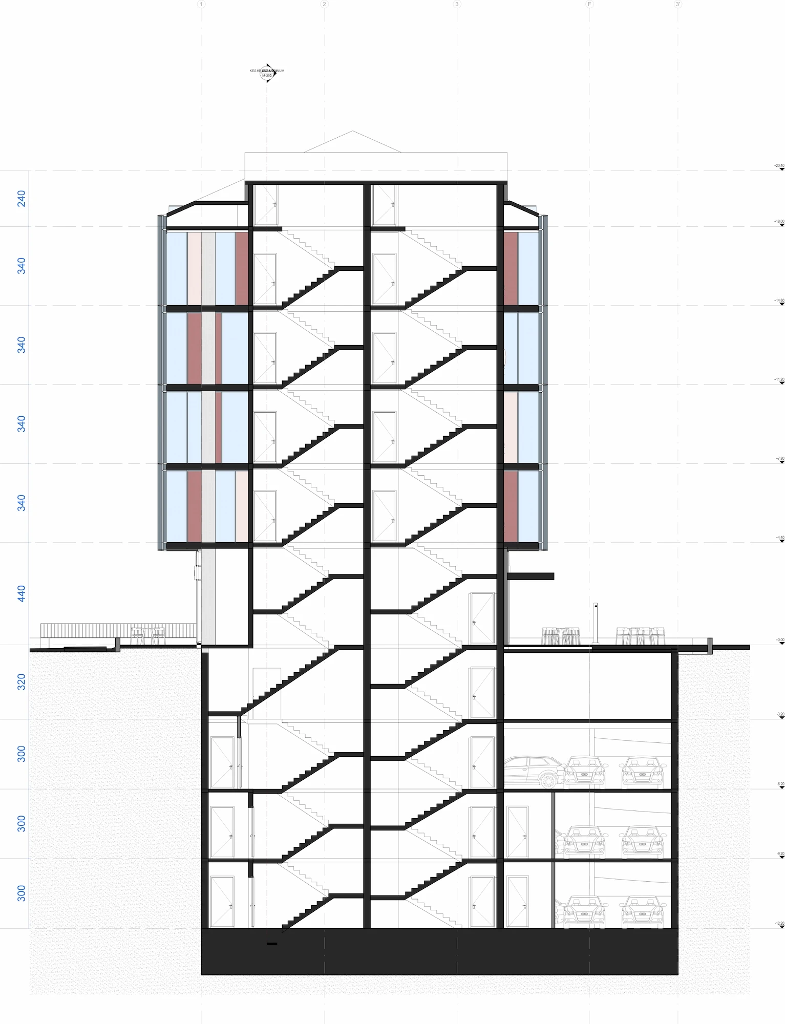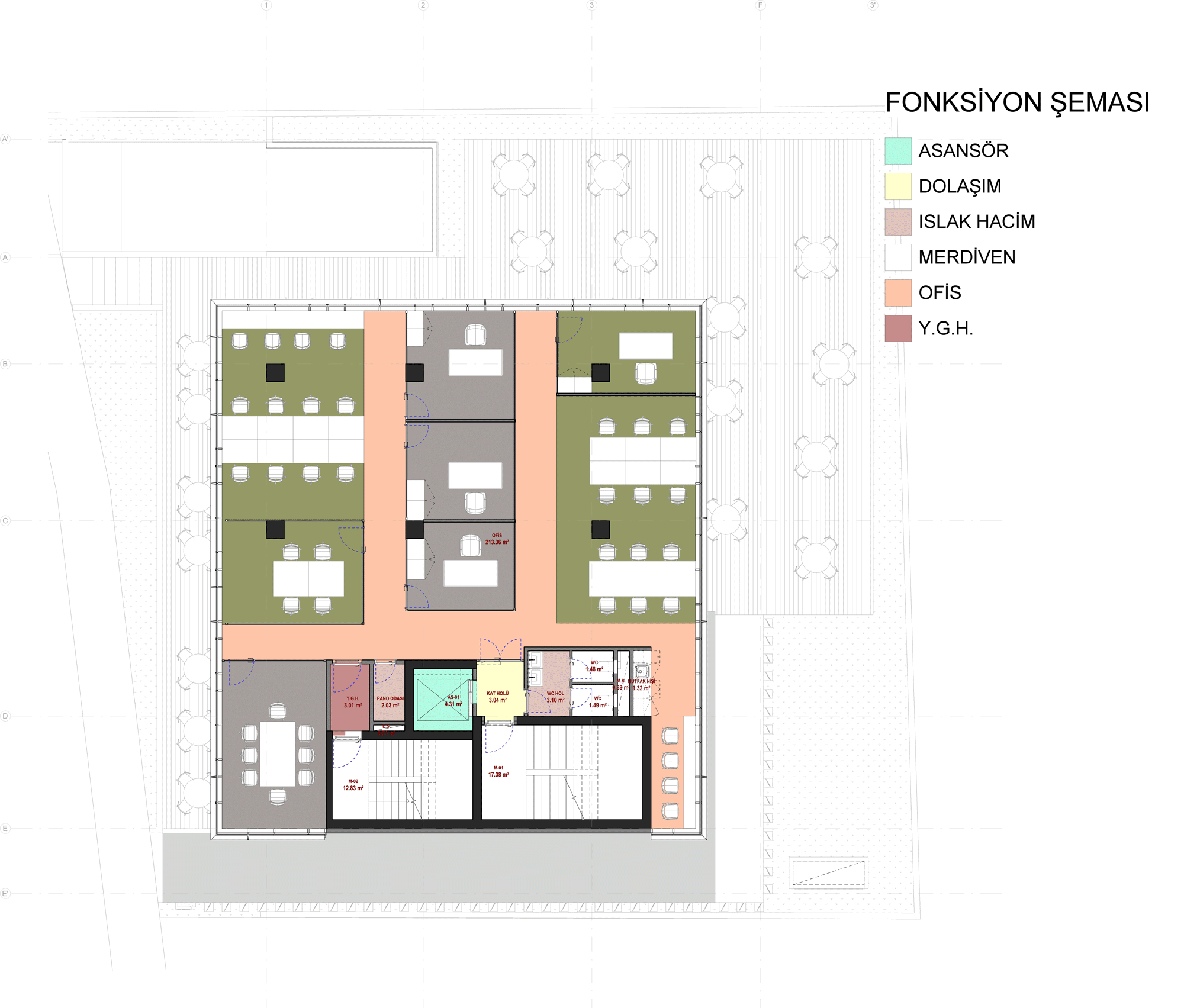 Due to fire regulations, the building requires two different fire escapes which act as a core for the vertical circulation. In that regard balancing a floor plate that provides for a sustainable office area was one of the main challenges to overcome. Three different design alternatives were developed to connect the four lower basement floors with the rooftop and the four office floors. Selected design alternative was able to provide a flexible office environment with the maximum working area, with a visual connection through all four facades. Organization of the two fire escapes and service areas in the building allowed for a wider scope of areas including improved storage and shelter areas alongside a parking area with a capacity of thirty-nine vehicles. Parking floors are accessed with a vehicle elevator due to the limited land area on the ground floor.