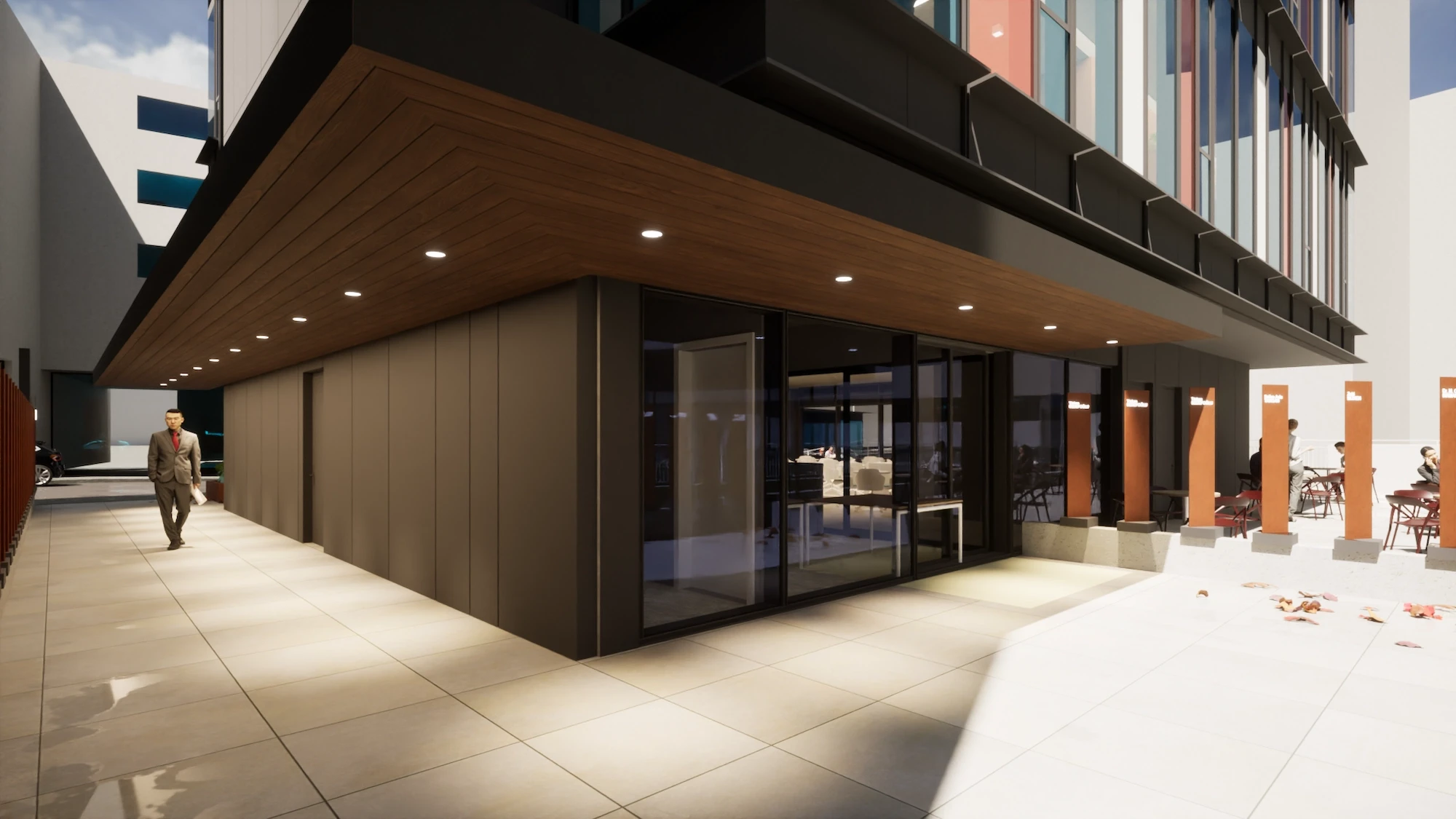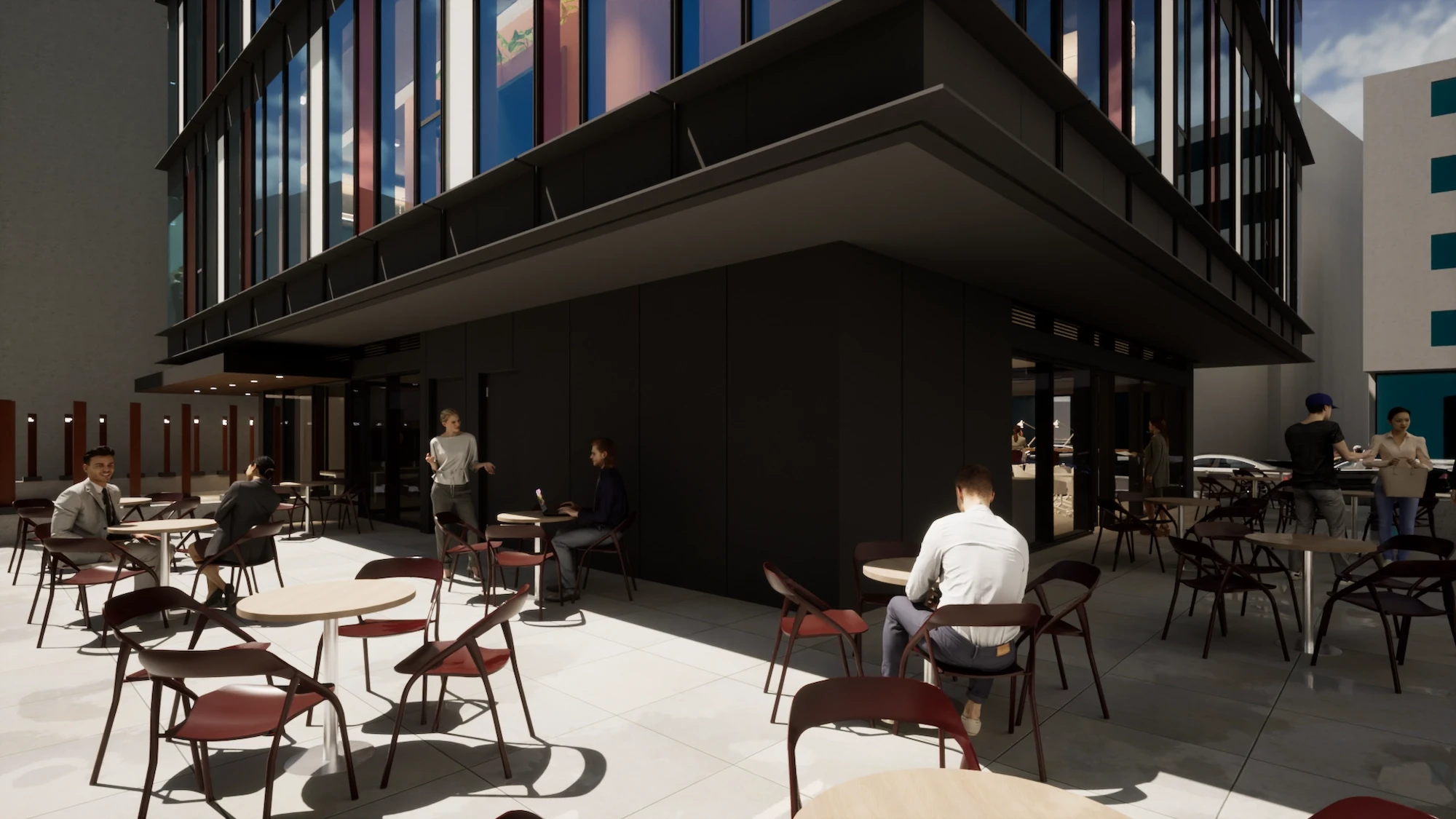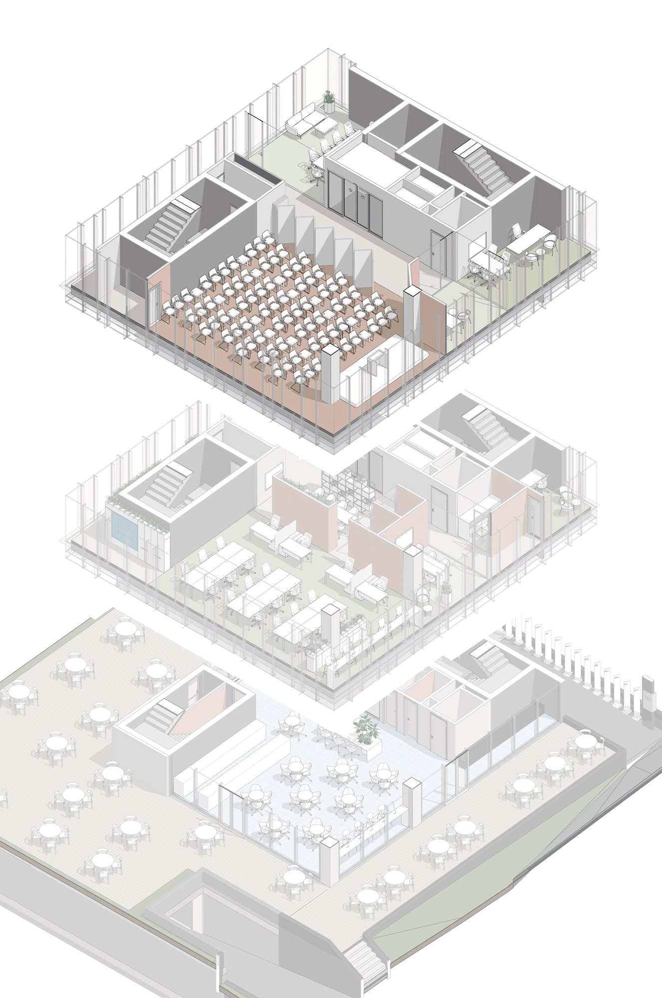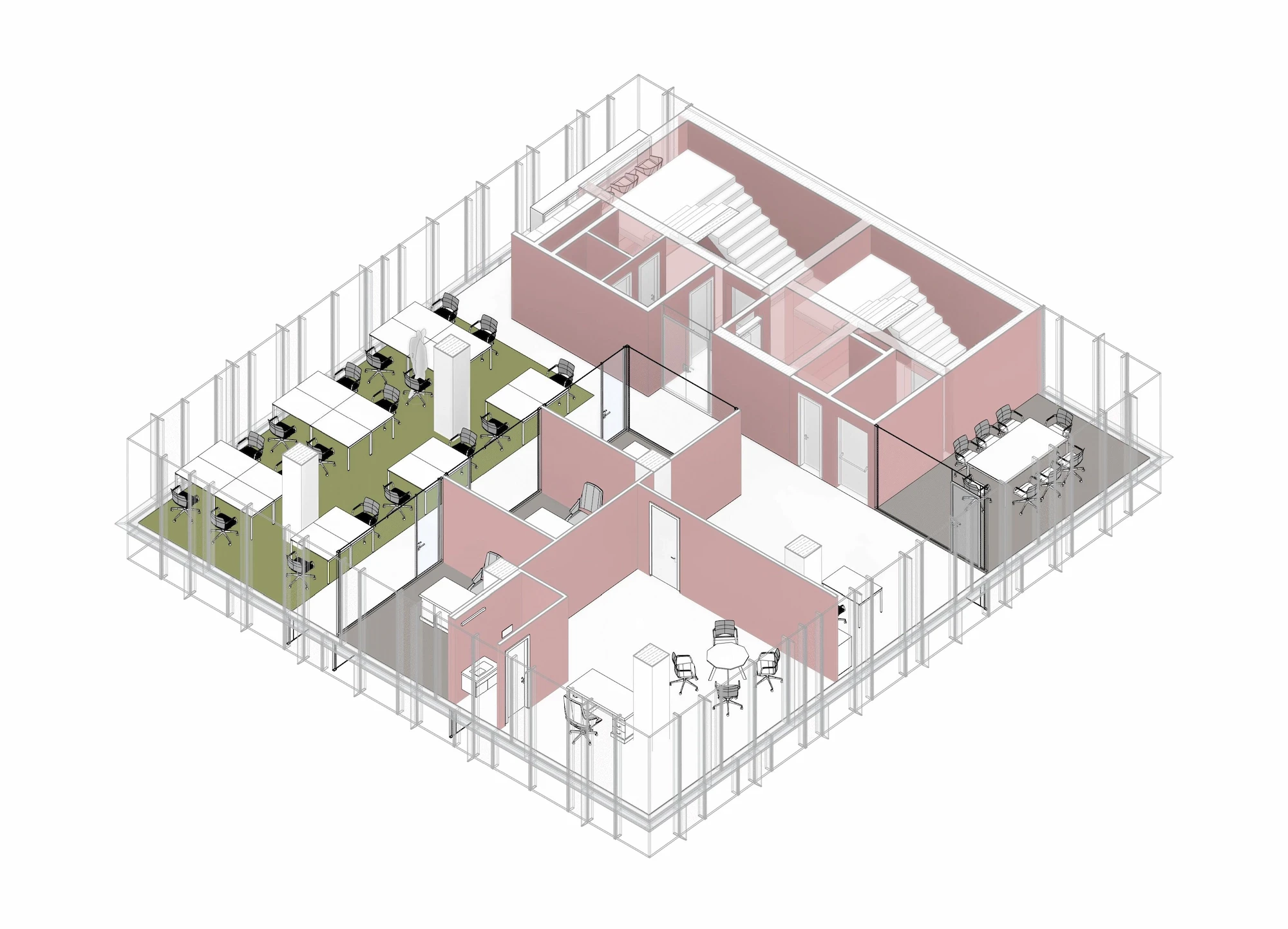 Due to fire regulations, the building requires two different fire escapes which act as a core for the vertical circulation. In that regard balancing a floor plate that provides for a sustainable office area was one of the main challenges to overcome. Three different design alternatives were developed to connect the four lower basement floors with the rooftop and the four office floors. Selected design alternative was able to provide a flexible office environment with the maximum working area, with a visual connection through all four facades. Organization of the two fire escapes and service areas in the building allowed for a wider scope of areas including improved storage and shelter areas alongside a parking area with a capacity of thirty-nine vehicles. Parking floors are accessed with a vehicle elevator due to the limited land area on the ground floor.