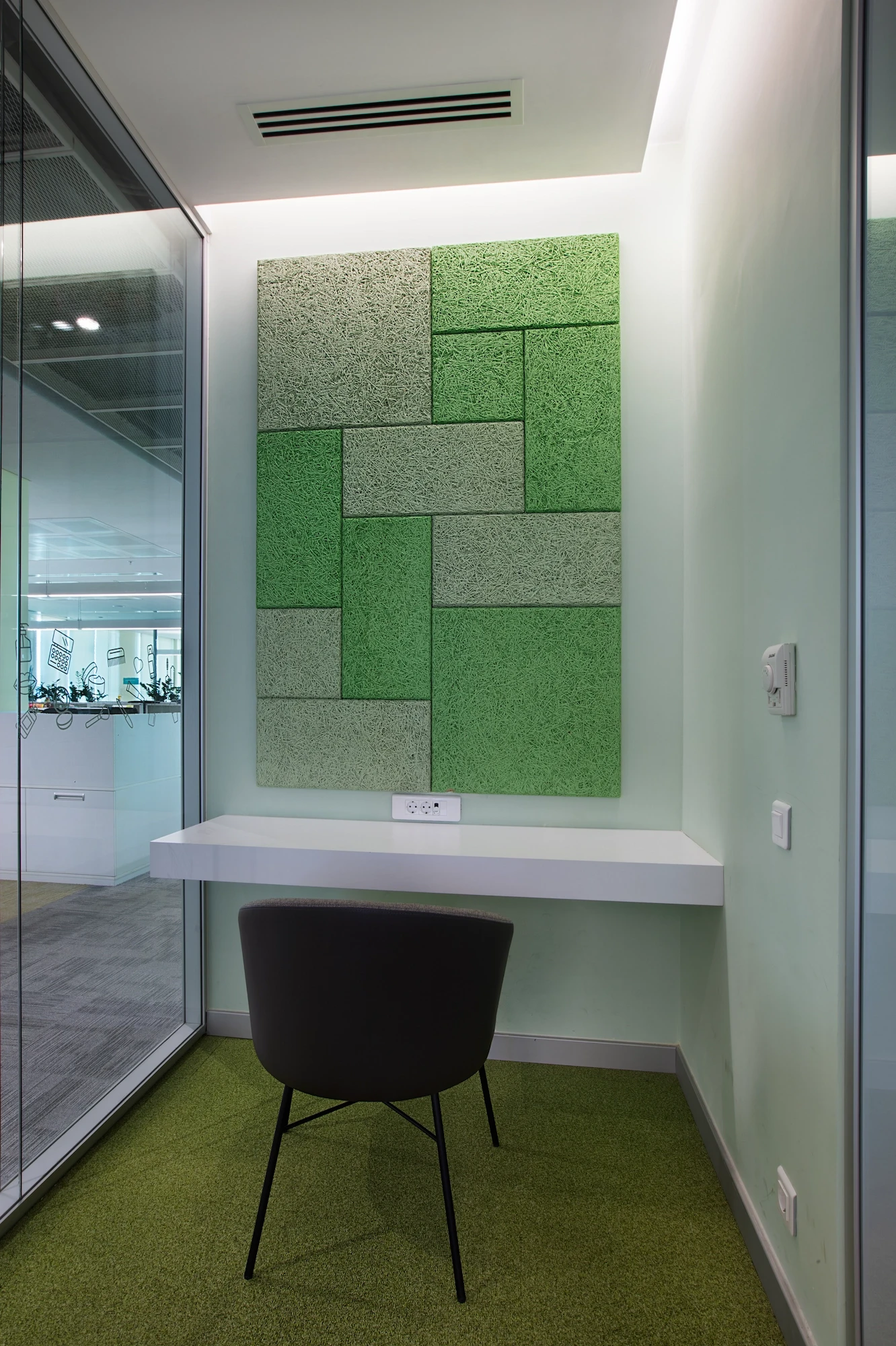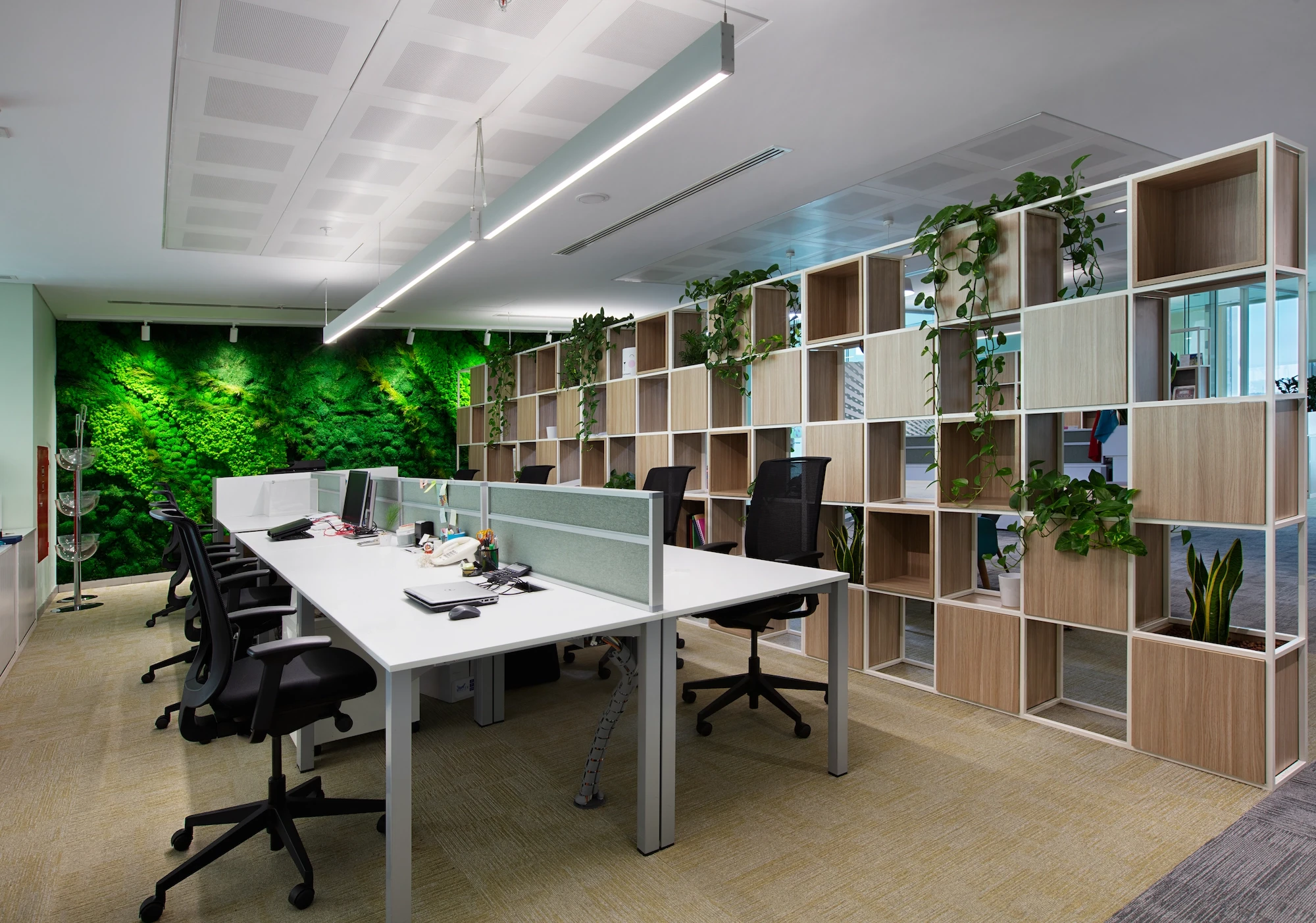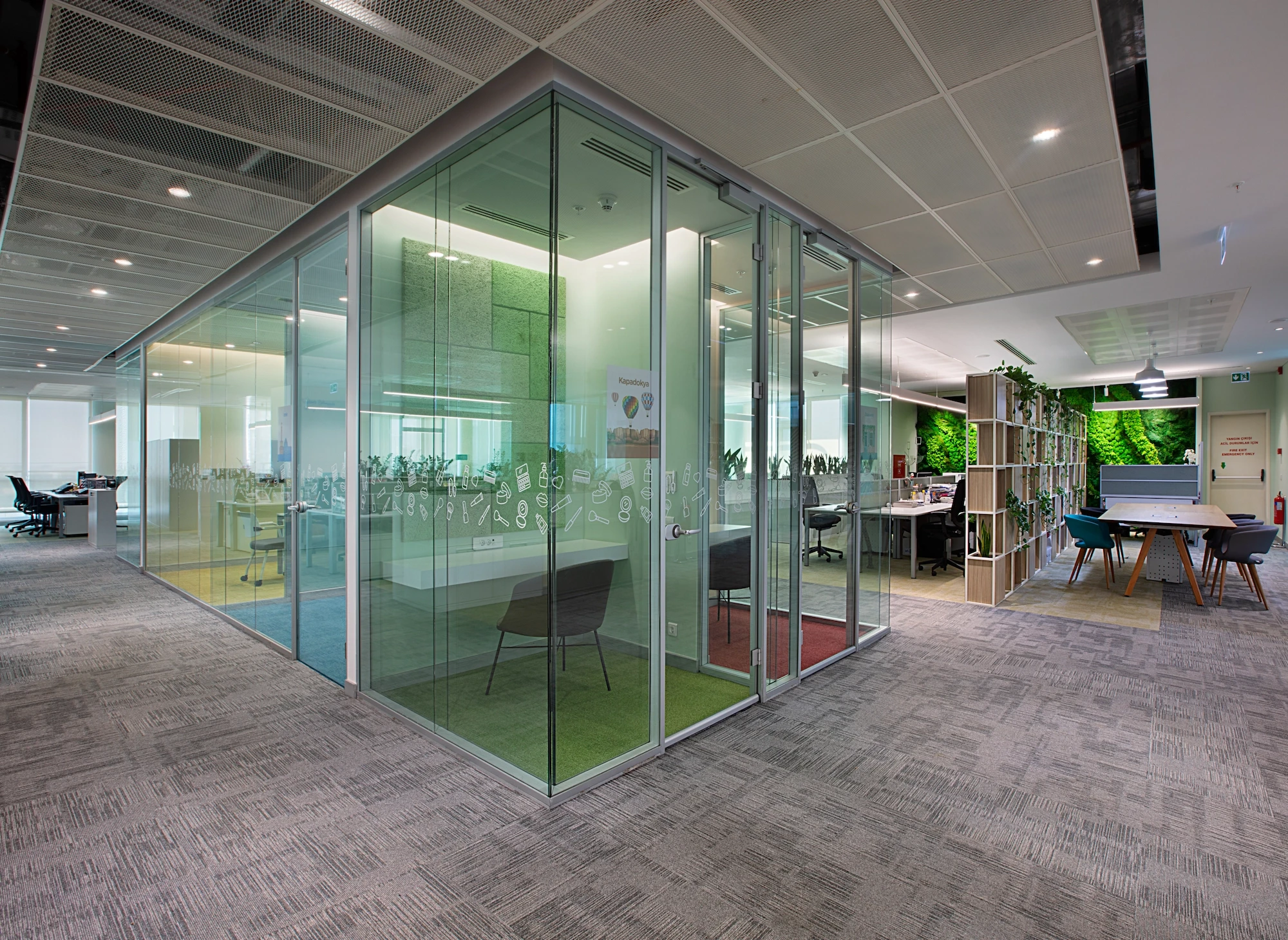 Instead of the usual layout that preserves the prestigious or scenic points of the area for the managers, the manager's rooms were canceled by proposing a new layout where the teams and their managers were located with a more transparent relationship. Thus, open offices were placed close to the facade to have the natural light directly, and the managers were positioned with their teams. Closed common areas such as meeting rooms and quiet rooms are located in the middle parts of the space which are more distant to natural light. While this order aims to increase the motivation and efficiency of the employees, biophilic design principles which exist due to the need of being close to the nature were also used and the design was supported with natural elements and colors used in the space. In this way, it is ensured that all office workers are located close to natural light and directly related to other natural elements such as green walls and real plants. While applying the principles of being close to nature, the colorful corporate identity of the company has been reflected to the space and created a lively environment.