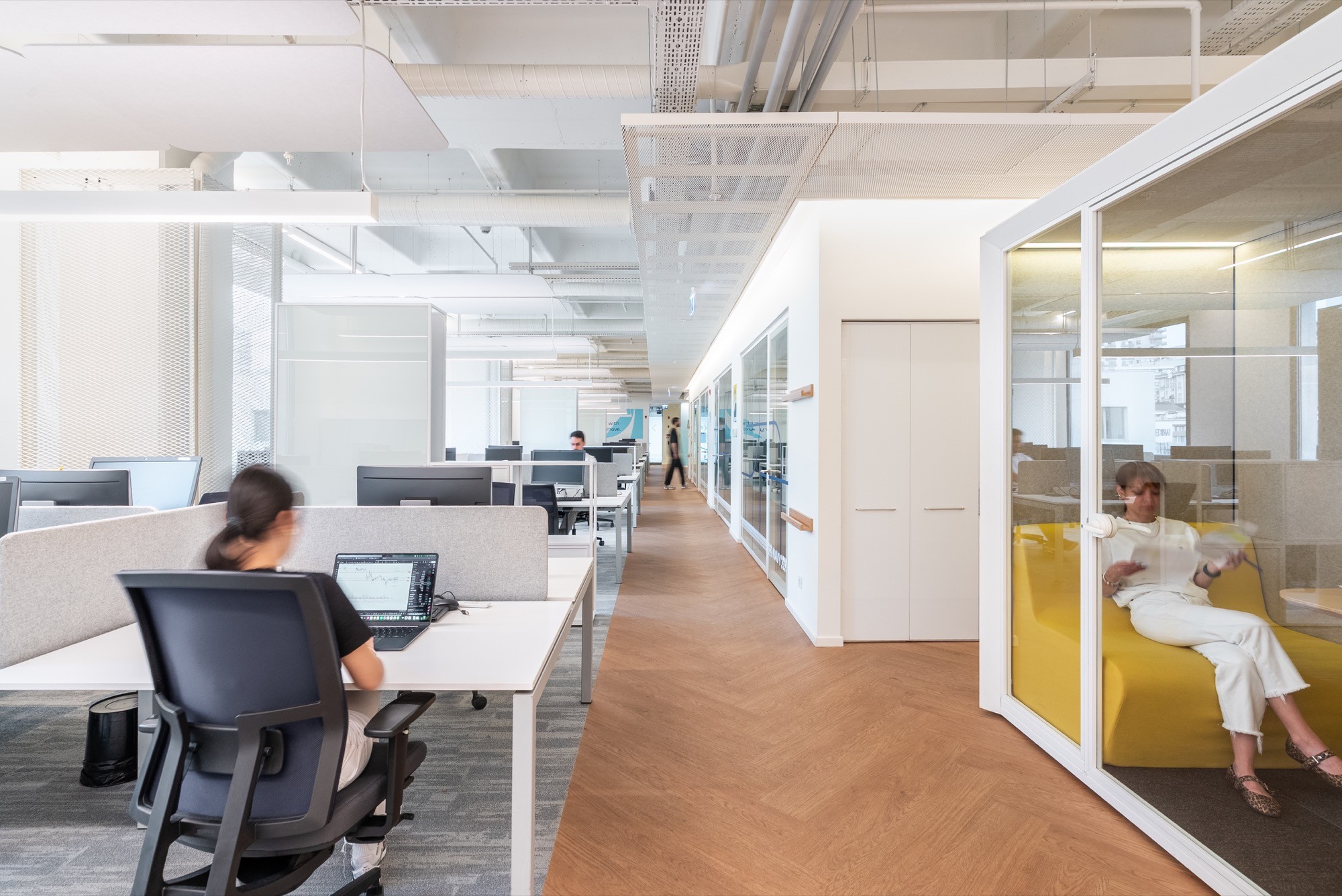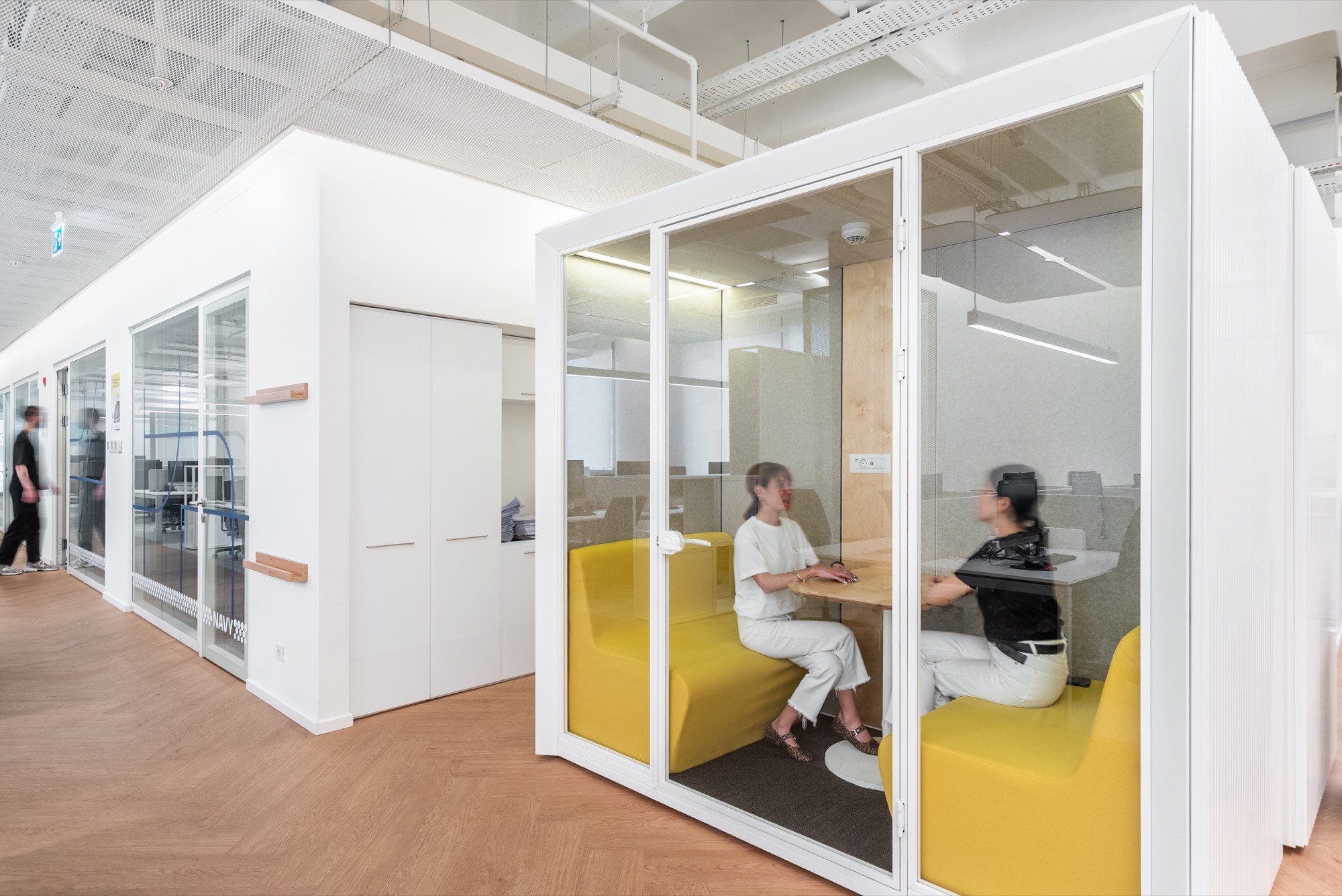 High-backed work booths and curved acoustic panels create micro-environments of calm and concentration. Complemented by soft, diffused lighting and accent furniture in warm yellow hues, these pods allow for mindful isolation within a larger open setting.Vibrant Locker Corridor: