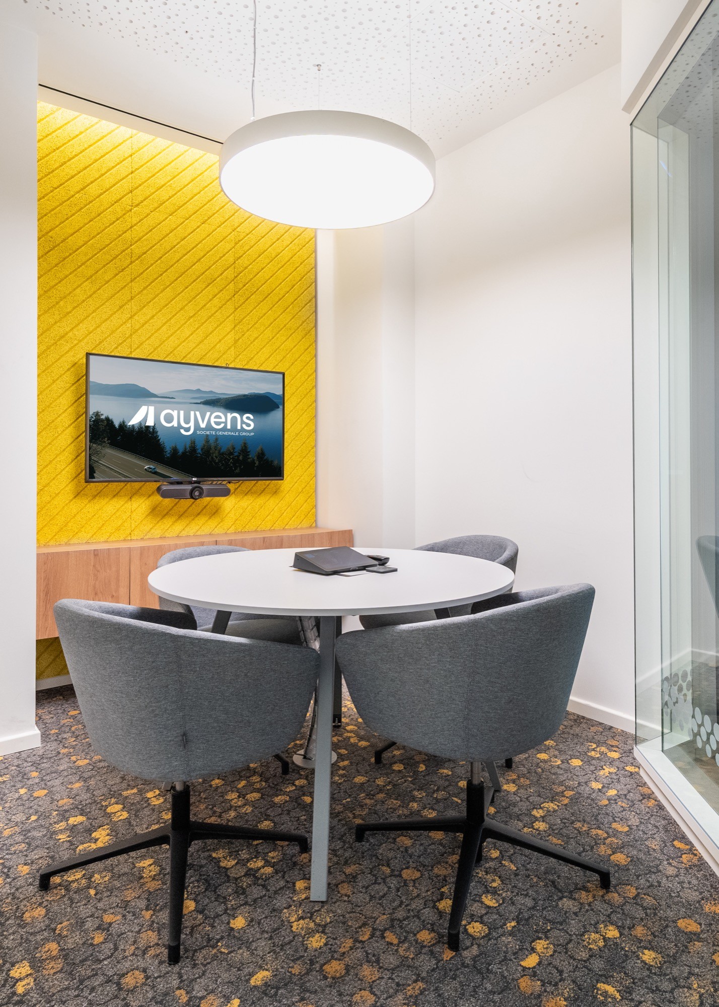 The entire space is fitted with user-friendly power access, integrated screens, and modern acoustic solutions — ensuring functionality without visual clutter. Circular ceiling lighting, textured carpeting, and light wood flooring all contribute to a soft, tactile material palette.