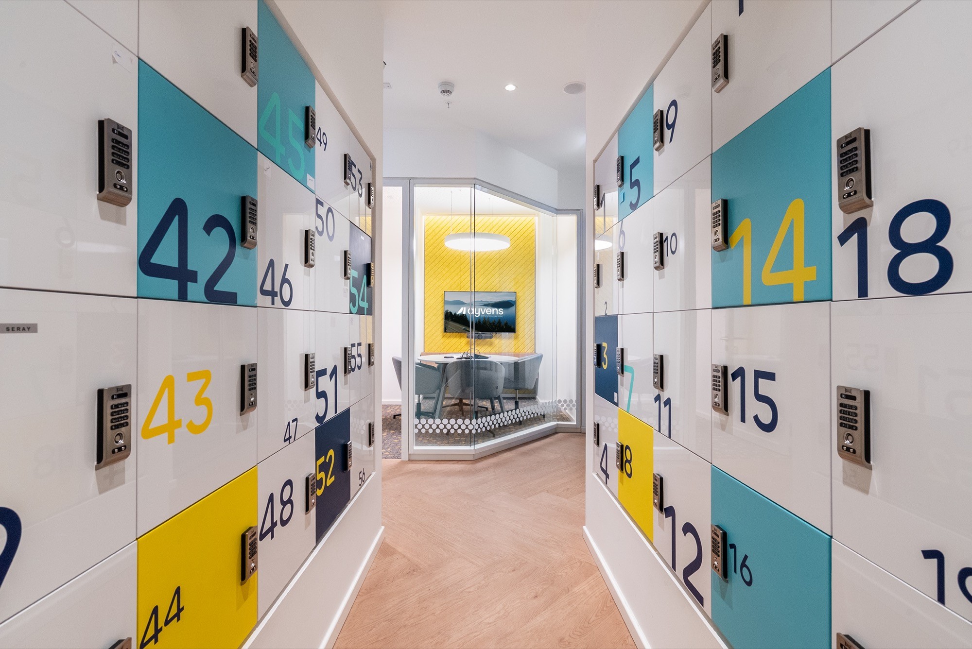 A dynamic hallway lined with numbered, color-blocked lockers adds a sense of play to the daily routine. The corridor subtly leads into a glass-enclosed meeting space, framed by a cheerful yellow acoustic backdrop that reinforces the design’s focus on both clarity and energy.Integrated Technology & Comfort: