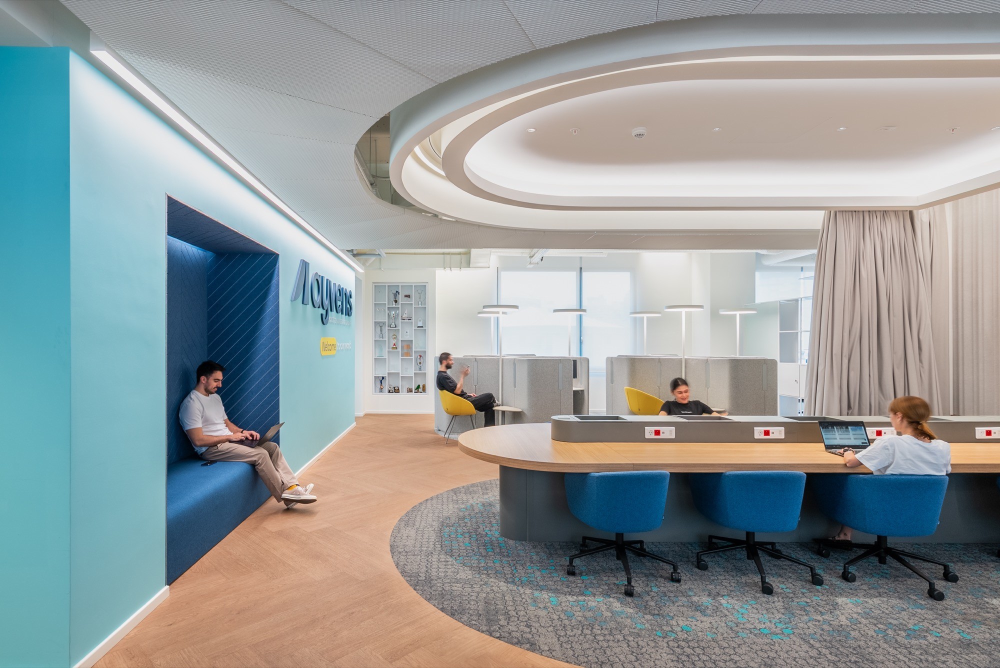 Flexible seating solutions dominate the open-plan area, with ergonomically designed furniture in calming greys and pops of blue and yellow. The communal worktable, equipped with accessible power modules, promotes collaboration without compromising individual focus.Privacy Pods & Focus Zones: